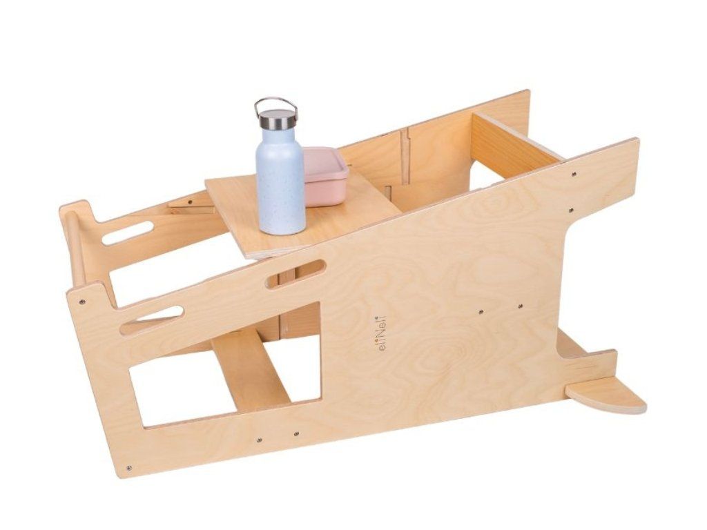 Ez a sokoldalú segédeszköz könnyen átalakítható gyermekasztallá és -székké, ahol a gyerekek alkothatnak és falatozhatnak. Egyszerűen fektesse le a növekvő tanulótornyot a padlóra, és helezze át a lapot, amelyen a gyerekek a tanulótoronyban állnak. A deszka asztallapként szolgál.