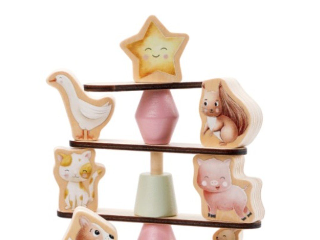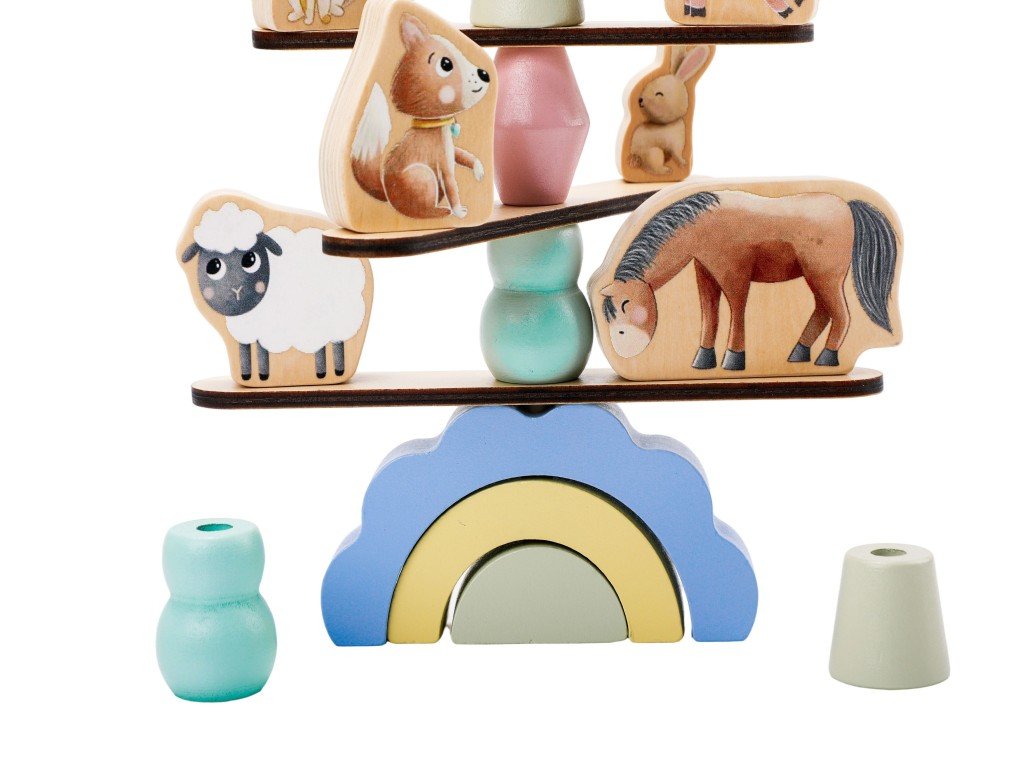 A vidám állatokkal ellátott fa egyensúlyozó játék végtelen szórakozási és kreativitási lehetőségeket kínál. A gyerekek játszhatnak csak az állatokkal, az összecsukható szivárvánnyal, vagy magas piramisokat építhetnek – minden a fantáziájukon múlik. Minden darab szinte bárhol egyensúlyozhat, és a gyerekek kipróbálhatják a darabok kombinálását és összekapcsolását, hogy a lehető legmagasabb és legstabilabb építményt hozzák létre. A játék során fejlődik a finom motorika, a szem és a kéz koordinációja, a logikai gondolkodás és a térbeli képzelőerő. A gyerekek egyúttal gyakorolják a türelmet, a koncentrációt és a kreativitást, közös játék közben szociális kapcsolatokat építenek és élvezik a barátaikkal vagy szüleikkel töltött időt.
