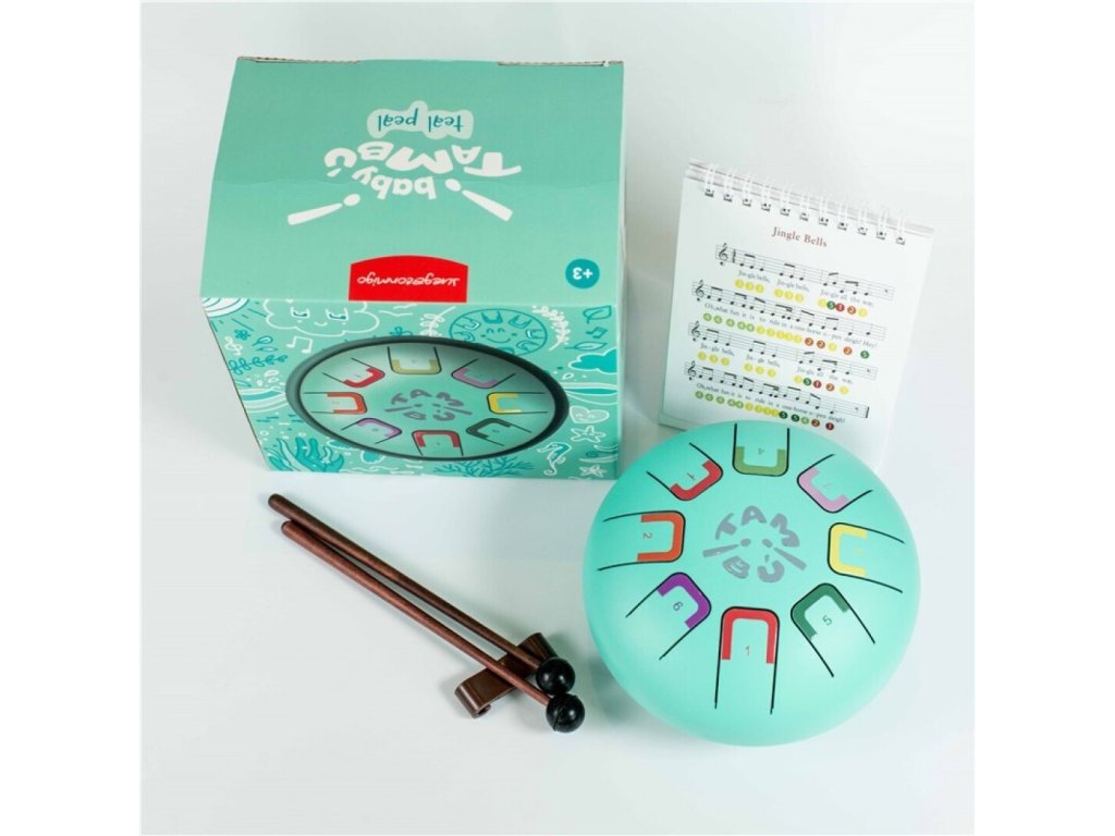 A baby nyelvdob egy dallamos hangszer, finom, bársonyos hangzással, amely természetesen nyugtató és pihentető érzést kelt. Ideális gyerekeknek és felnőtteknek, kezdőknek és haladóknak egyaránt. A színes és számokkal jelölt hangok miatt a tanulás könnyű és intuitív, így szinte azonnal elkezdhet játszani, előzetes zenei tapasztalatok nélkül. A hangszer C-dúr (Sol) diatonikus skálára van hangolva, amely minden ütésnél harmonikusan és kellemesen hangzik, függetlenül attól, hogy kottából játszol, vagy csak úgy, a saját örömödre. A nyelvdob remek társ a pihenéshez, a kreatív felfedezésekhez és a közös zenei élményekhez a gyerekekkel. A csomaghoz egyszerű kották is tartoznak angol nyelven.