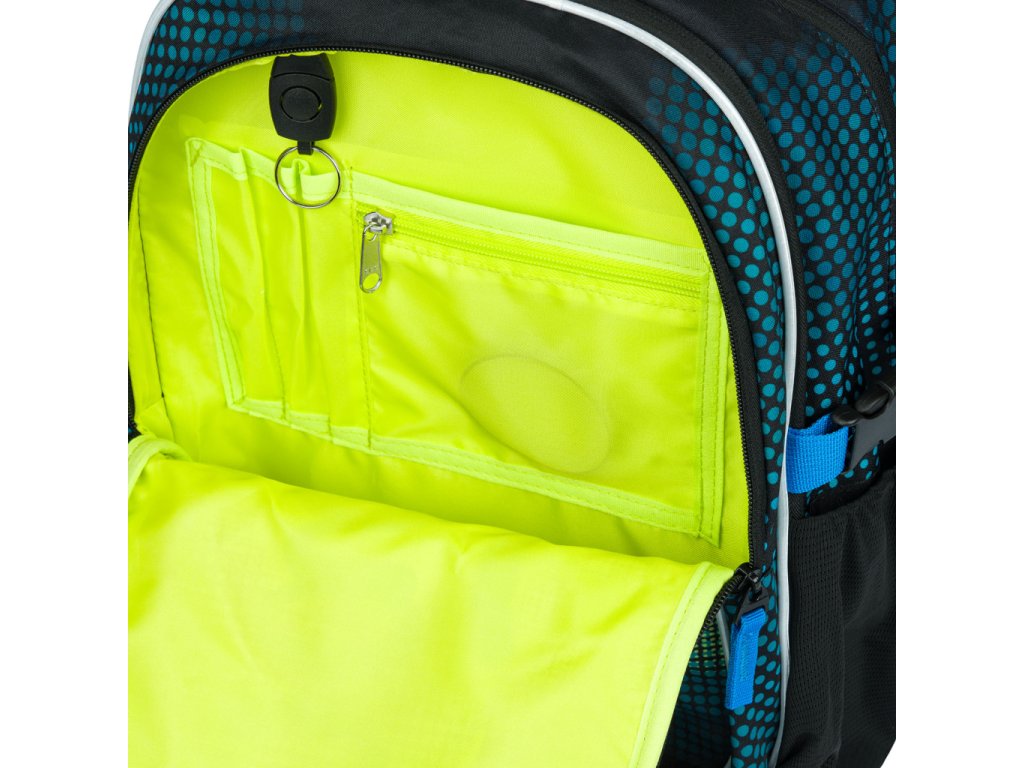 A hátizsák három külön zárható rekesszel rendelkezik, belső rendszerezővel és 15"-os laptop/tablet zsebbel. Oldalain erős anyagból készült kulacstartó zsebek találhatók, valamint egy síp alakú függődísz, amely kulcstartóként is használható. A fényvisszaverő elemek növelik a biztonságot.