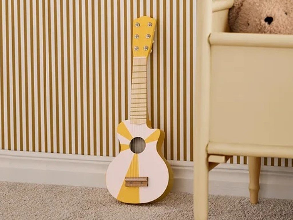 Dětská dřevěná kytara ve žluto-bílém provedení je ideální hračkou, kterou si zamilují všechny děti, které mají radost z hudby. Hraní bude pro kluky i holčičky zábava a mimo jiné si procvičí motorické dovednosti. Jakmile trochu povyrostou, možná projeví zájem o opravdový hudební nástroj. Co takhle uspořádat koncert pro kamarády nebo prarodiče? Zkoušením na takovou událost si užijete příjemný společný čas.
