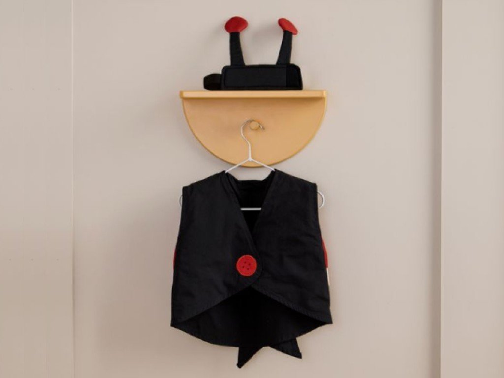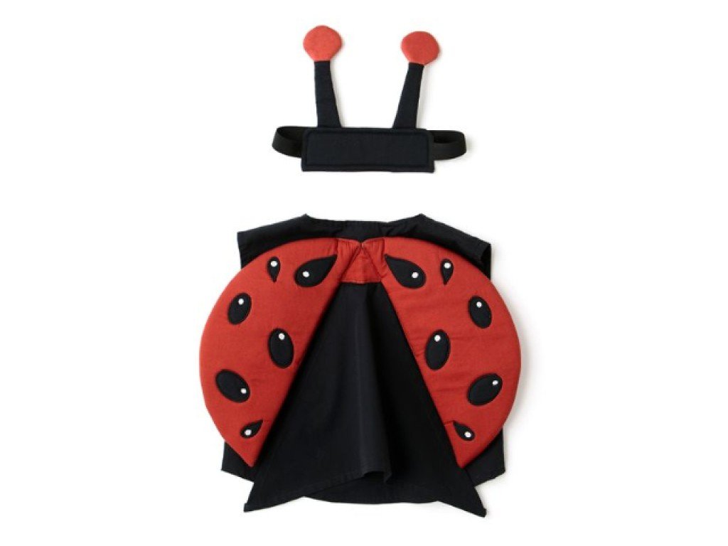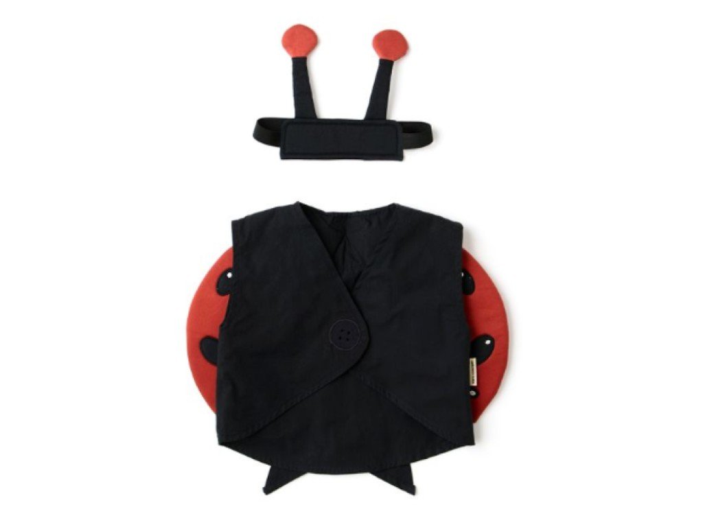 Měkká černá vesta s polstrovanými červenými krovkami je doplněná čelenkou s tykadly, která dotváří celkový vzhled. Snadno se zapíná na suchý zip, aby bylo oblékání i svlékání pro děti co nejpohodlnější.