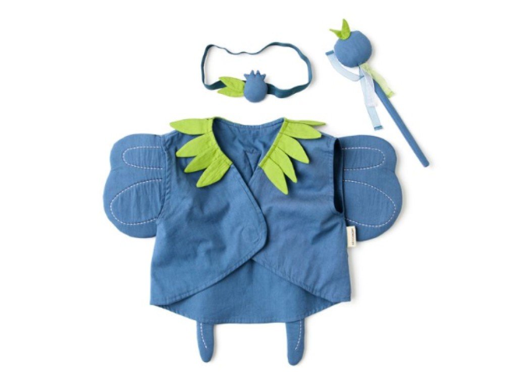 Roztomilý borůvkový kostým přinese do dětské hry kouzlo léta, fantazie i osvěžující dobrodružství. Modrá vesta má zaoblenou přední část, zelený límec s listy a praktické zapínání na suchý zip, díky kterému se snadno obléká i svléká. Záda kostýmu zdobí malá vycpaná křídla, která dodávají celé sadě pohádkový nádech. Kostým je nejen stylovým převlekem, ale i skvělým pomocníkem pro rozvoj fantazie a tvořivé hry. Nechybí ani čelenka s ozdobnou borůvkou a ladící hůlka, se kterou mohou děti proměňovat svůj svět, třeba v kouzelnou borůvkovou zahradu.