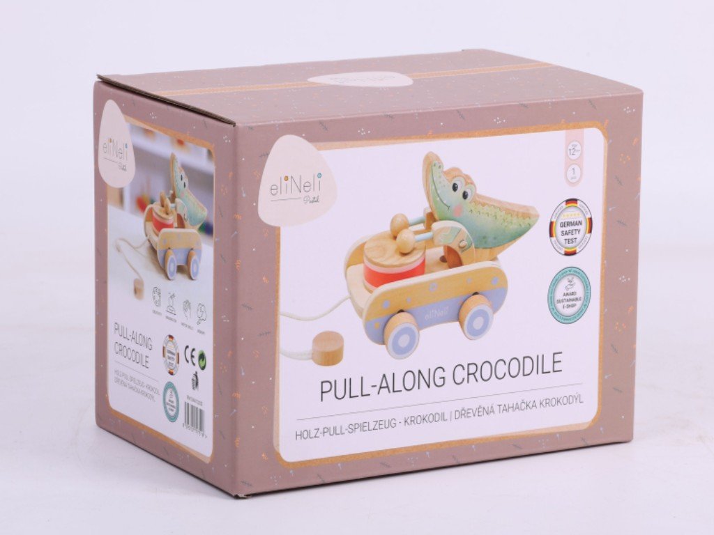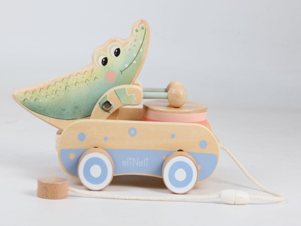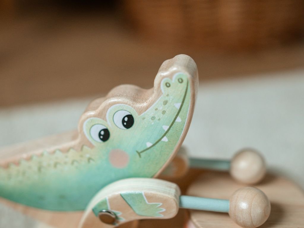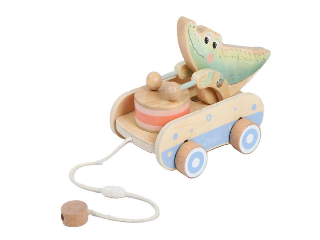 A fából készült húzható játék, amely egy aranyos krokodil barát formájában készült, a gyerekek kedvenc társává válik az első lépéseik során. Már a térdelés során is a krokodil lelkesen bátorítja a gyerekeket a további próbálkozásokra. Mozgás közben kezei a dobokkal hangot adnak, és vidám ritmust hoznak létre, amely ösztönzi a kíváncsiságot és természetesen fejleszti a zenei érzéket.