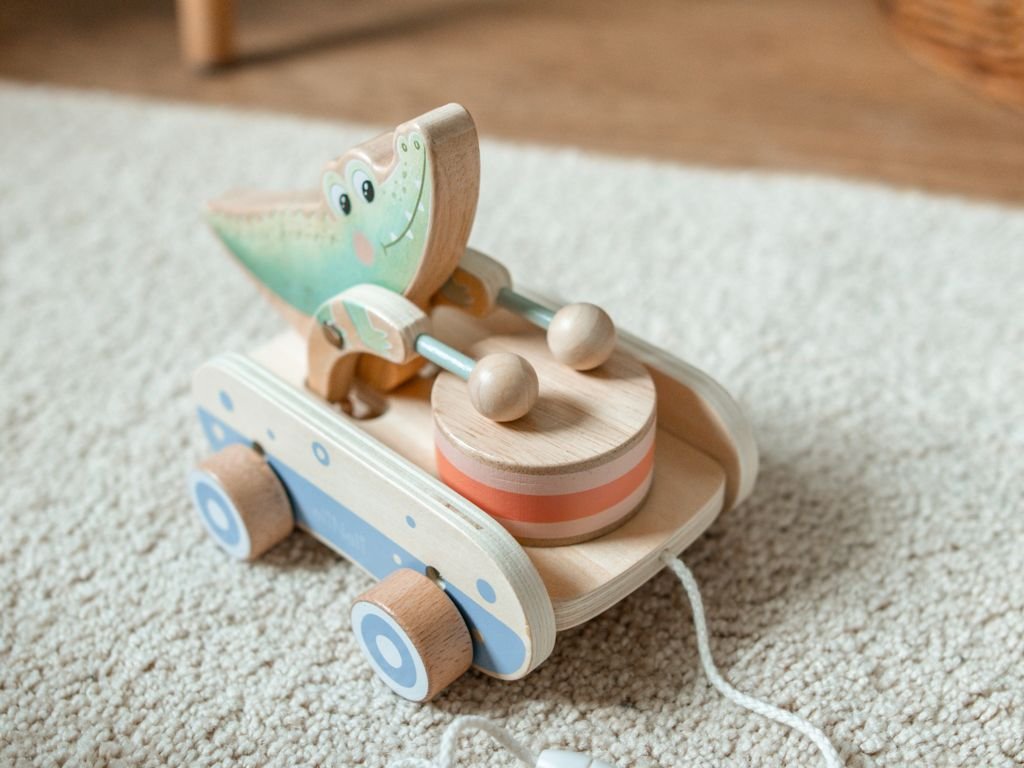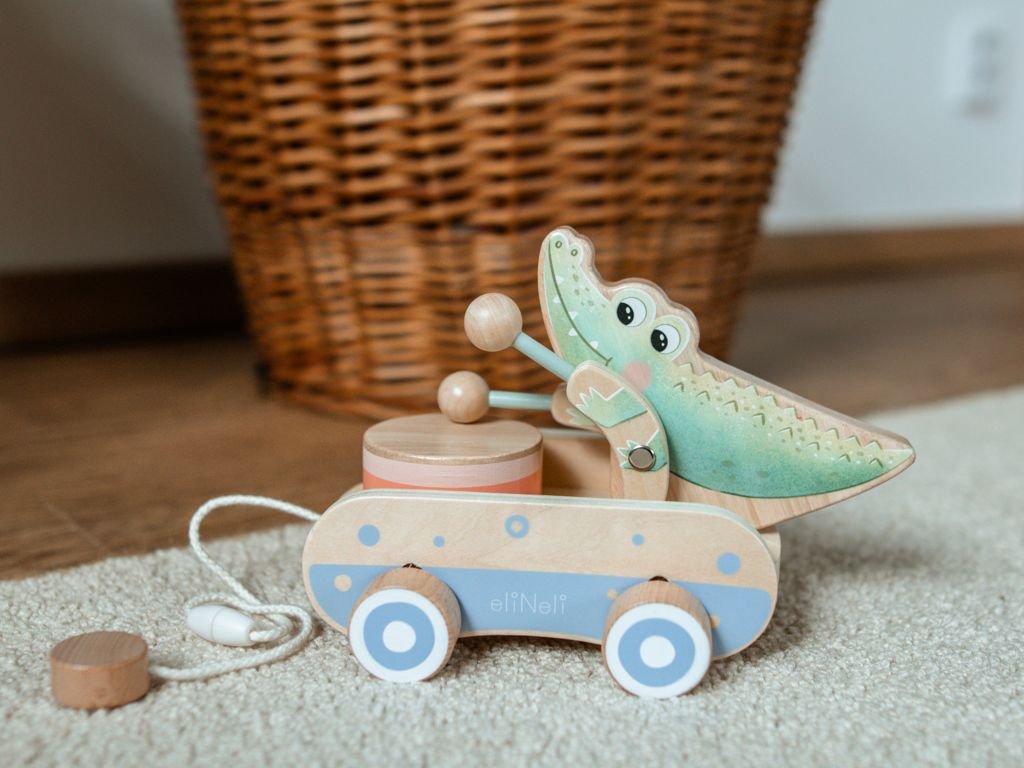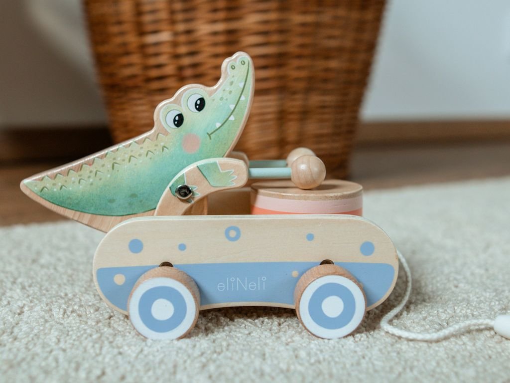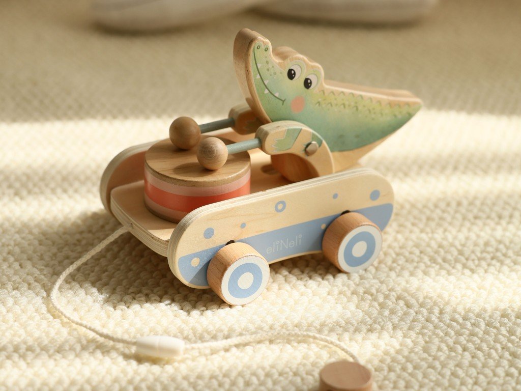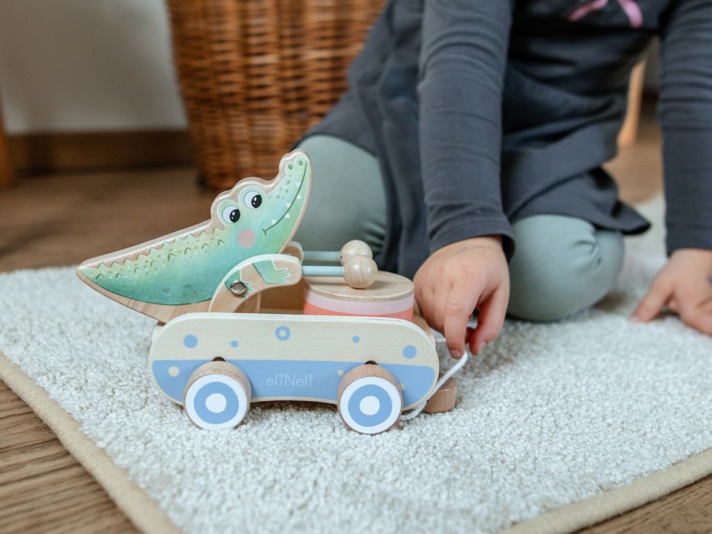 A fából készült húzható játék, amely egy aranyos krokodil barát formájában készült, a gyerekek kedvenc társává válik az első lépéseik során. Már a térdelés során is a krokodil lelkesen bátorítja a gyerekeket a további próbálkozásokra. Mozgás közben kezei a dobokkal hangot adnak, és vidám ritmust hoznak létre, amely ösztönzi a kíváncsiságot és természetesen fejleszti a zenei érzéket.
