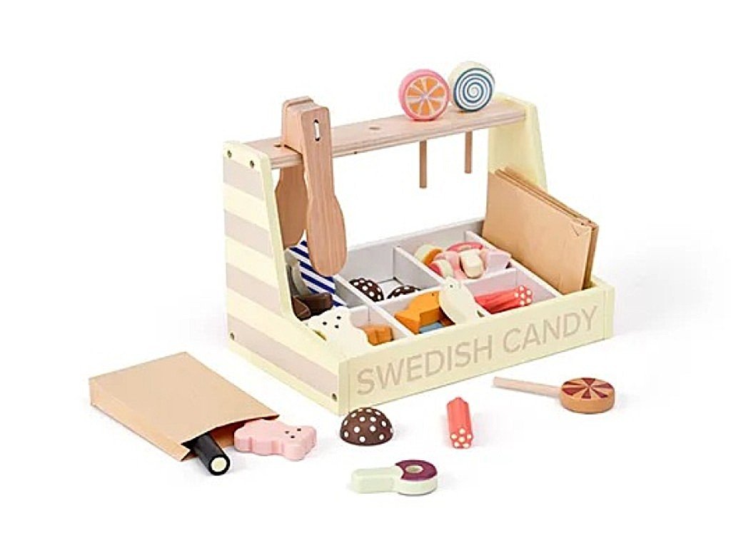 Obchod se sladkostmi promění každý dětský pokoj v útulný krámek, kde nechybí nejoblíbenější laskominy - gumoví medvídci, houbičky, lahve od coly, punčové pralinky, bonbony, lízátka, ovocné pendreky nebo lékořicové tyčinky, vše vyrobené z kvalitního dřeva s certifikací FSC a s nádhernými detaily. Děti si mohou hrát na prodavače i zákazníky, nabírat pamlsky pomocí přiložených kleští a balit je do papírových sáčků, přesně jako v opravdovém obchodě.