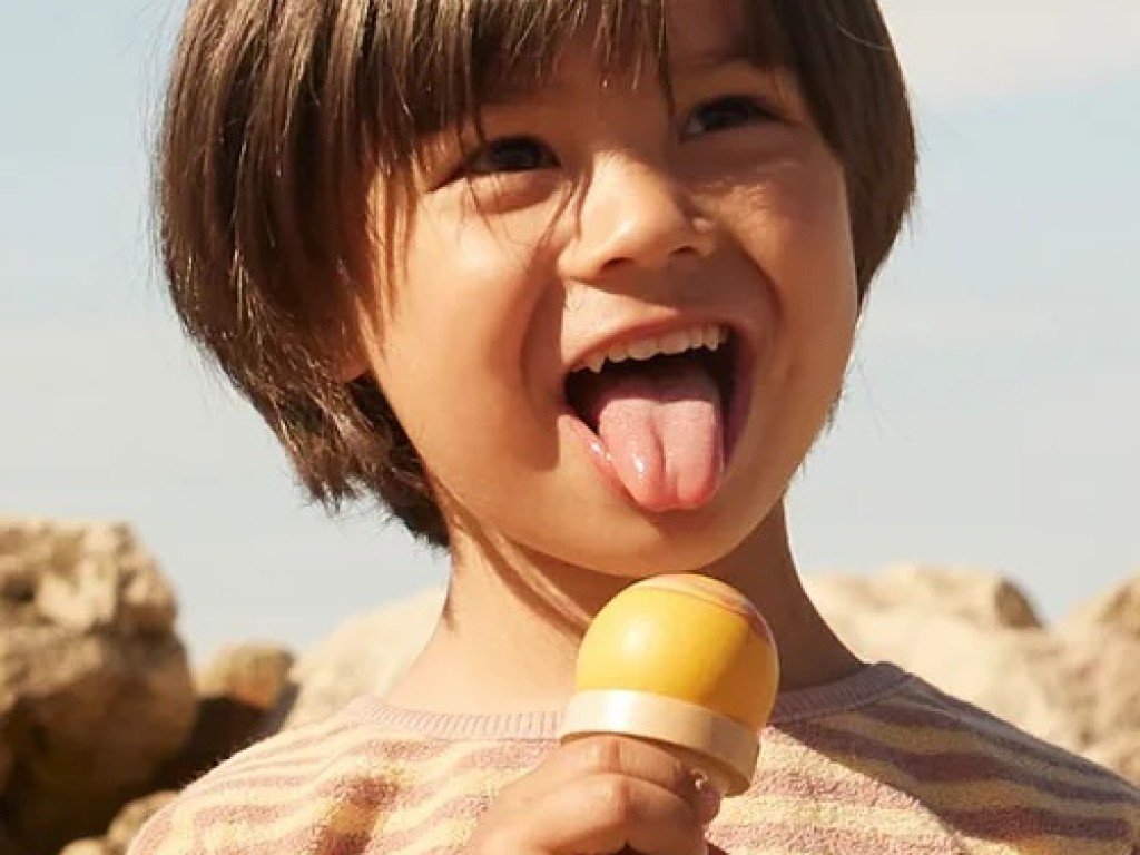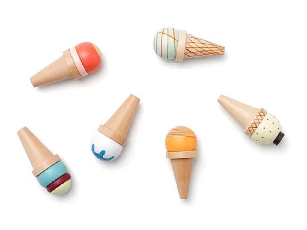 Se sadou šesti barevných dřevěných kornoutů si děti užijí nekonečné hraní na zmrzlináře. Každý kornout má originální design a společně jsou uloženy v praktické krabičce s víkem a šesti otvory, která vše udržuje přehledné a uklizené. Děti mohou v dětské kuchyňce či u prodejního stánku nabízet čokoládovou, vanilkovou i ovocnou zmrzlinu a při hře rozvíjet fantazii, komunikaci i slovní zásobu. Krabičku z certifikovaného dřeva FSC lze později využít například k ukládání malých drobností a pokladů.
