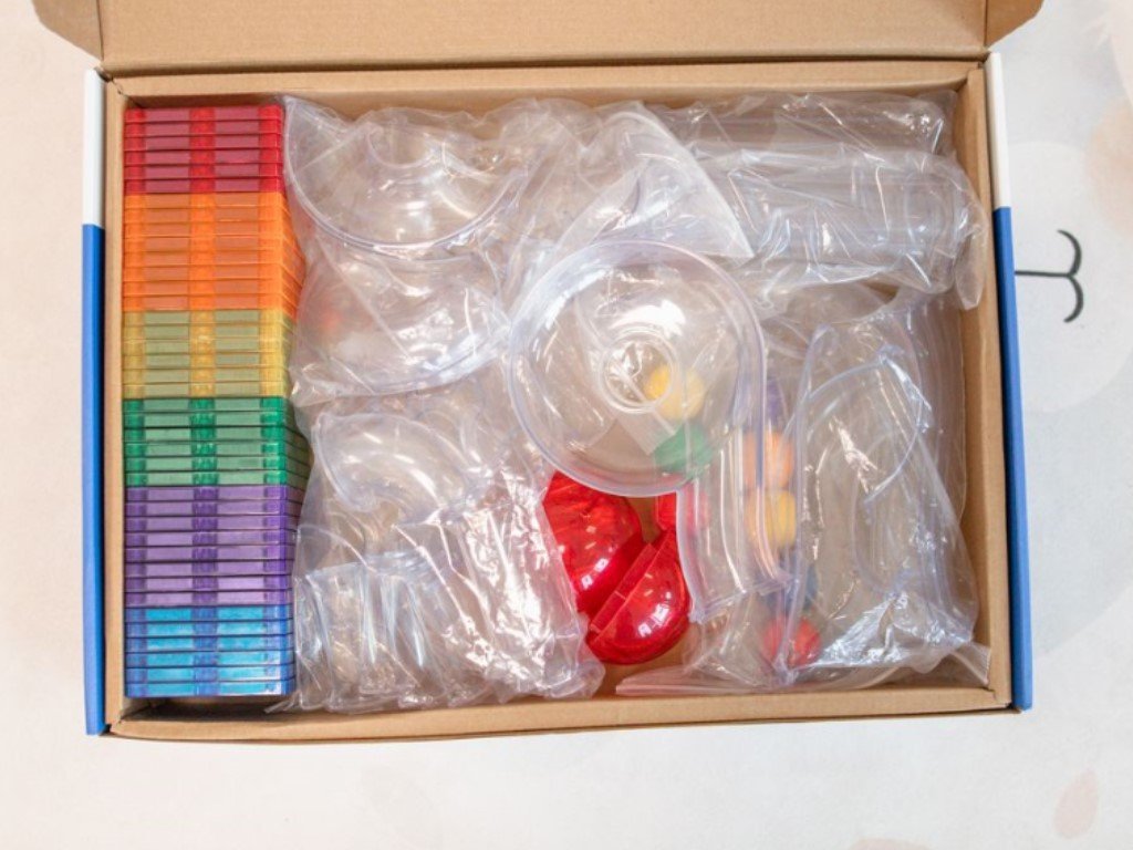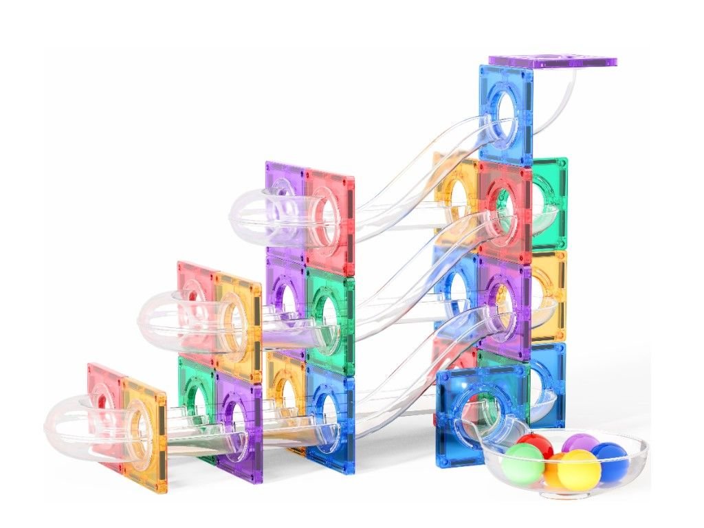 - A fa golyós változat csomagjának tartalma: 100 db (40 db összekötő négyzet, 8 db fa golyó, 10 db kis ívelt cső, 10 db nagy ívelt cső, 2 db spirálcső, 2 db tálca, 12 db rövid egyenes cső, 8 db hosszú egyenes cső, 6 db csúszda, 2 db felső fedél).