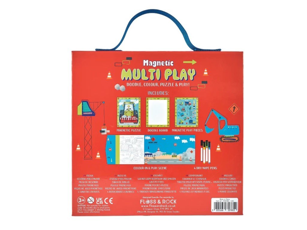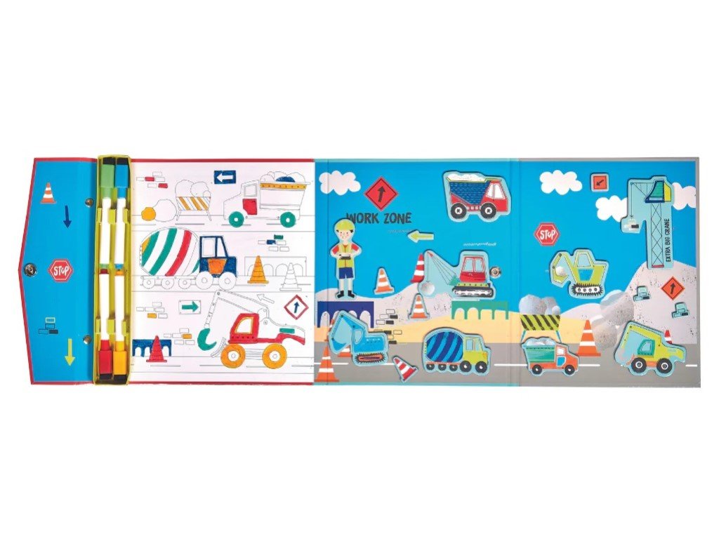 A multifunkcionális 4 az 1-ben mágneses játék praktikus és könnyen hordozható dobozban 4 szórakoztató tevékenységet rejt magában a kis építők számára. Azok a tevékenységek, amelyek szórakoztatják a gyerekeket, fejlesztik a készségeiket. A 20 darabos mágneses puzzle segítségével a gyerekek összeállíthatnak egy nagyszerű kotrógépet nagy kanállal és mosolygós kotrógép-vezetővel. A 4 színes filctoll segítségével a gyerekek kifesthetik a nagy teherautókat ábrázoló képet, vagy saját képet festhetnek a táblára, amelyet újra és újra le lehet törölni és újra festeni. A kotrógépek, keverőgépek, teherautók és daruk formájú mágnesek az egész mágneses építkezésen való játékra lettek kitalálva.