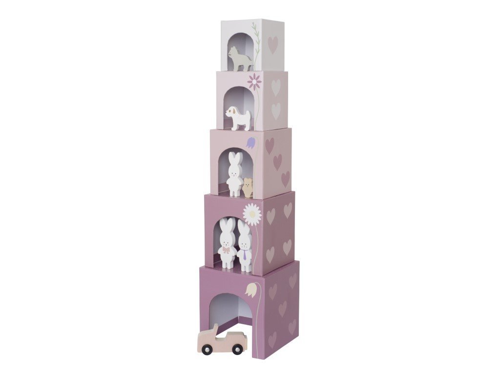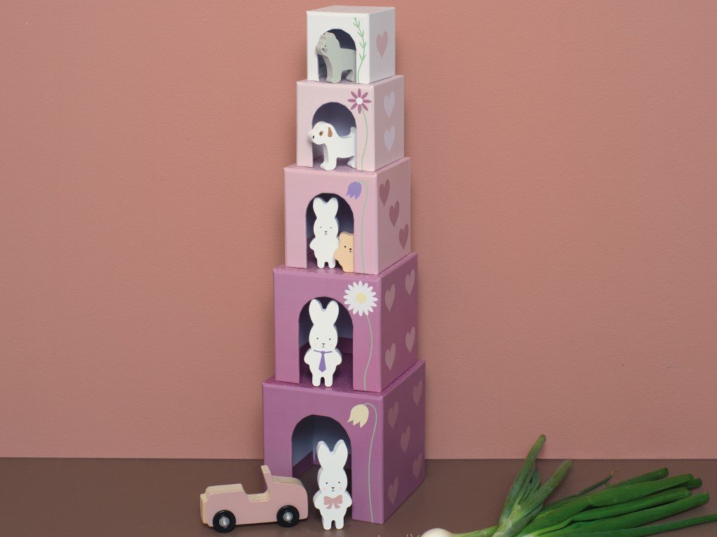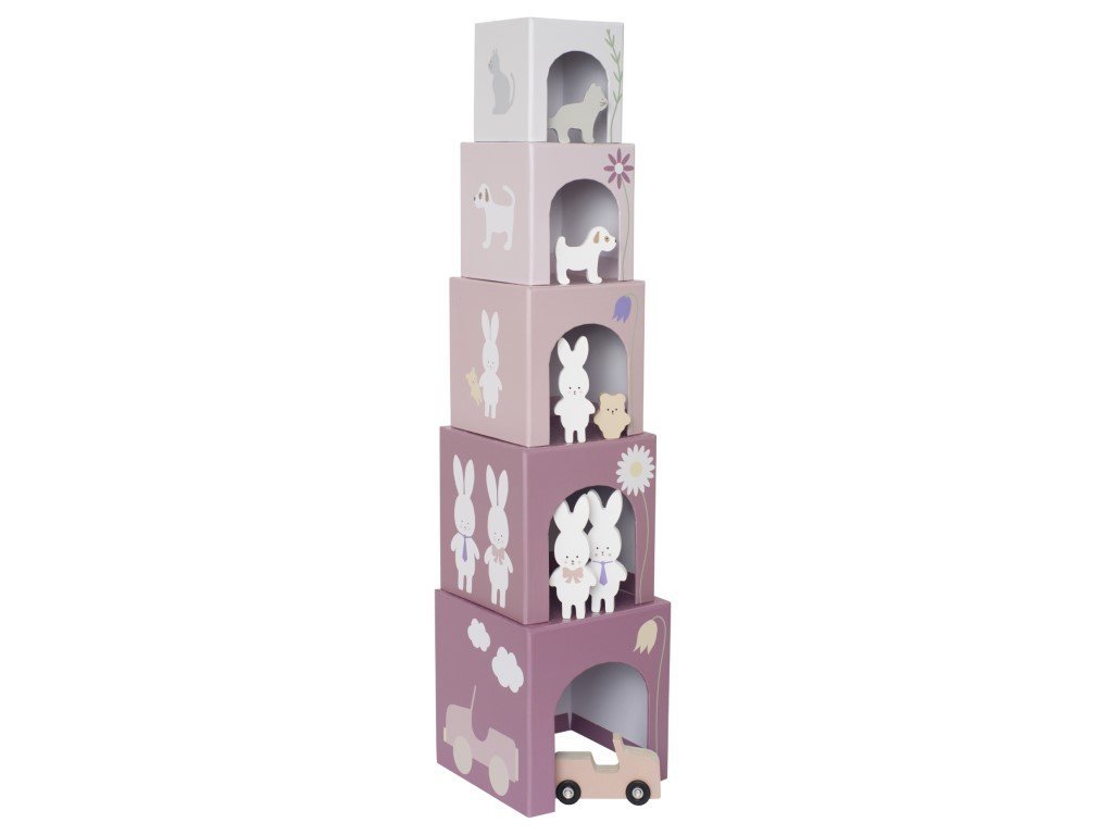 A nagy építő kockák a nyúlcsalád házai és egy koska a garázs a játékautó számára, ami végtelen szórakozás forrása. Különböző méretű kockákból kémény (piramis) építhető, és a gyerekek ugyanúgy szétteríthetik őket a padlón és játszhatnak a nyuszikkal, háziállatokkal és a játékautóval, amelyek a csomag részét képezik. Nyuszi papa, anyuka, egy kis nyuszi kedvenc macijával, kutyával és macskával, mindegyiknek megvan a saját háza, amit a gyerekek könnyen felismernek, köszönhetően a kockán található képnek. A kockák közül a legnagyobb a garázsé a rózsaszín kisautó számára. A kockákra színes szívek és számok vannak felvestve, amely az alapszámok és a számfelismerés terén segítik a gyerekeket. A kockával ugyanúgy eljátszanak lányok és fiúk a barátaikkal együtt.