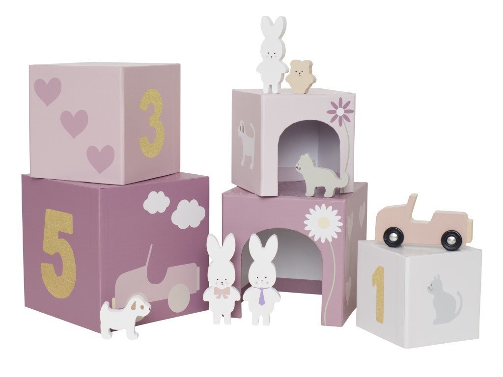 - Házak és garázs - a kockák közül a legnagyobb egy játékautó garázsa, a többi kocka egy nyúlcsalád és házi kedvenceik házai.