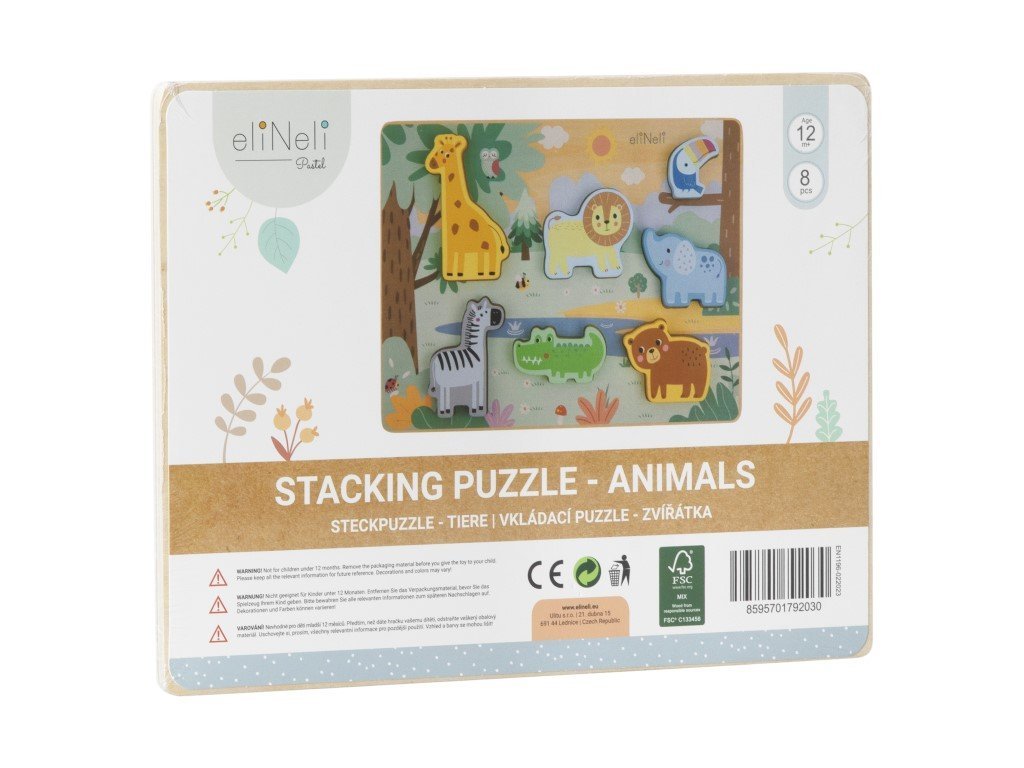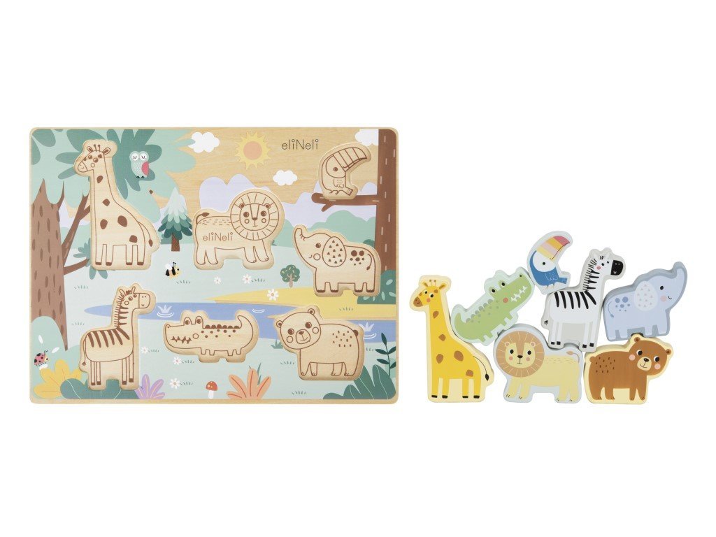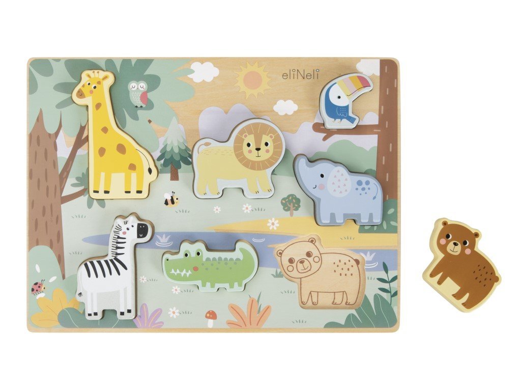 A népszerű állatkerti állatos fa puzzle 1 éves kortól nyújt szórakozást a gyerekeknek. Az aranyos állatok - zsiráf, zebra, oroszlán, krokodil, medve, elefánt és tukán - segítenek fejleszteni a gyerekek motorikus készségeit, a koordinációt, a képzelőerőt, megtanítják őket az állatok és még a színek felismerésére is. Ráadásul a gyerekeknek gondolkodniuk kell, amikor a beillesztős kirakóval játszanak, mert csak egy helyesen kiválasztott és elforgatott állat fog szépen illeszkedni a játéktáblán lévő kivágásba.
