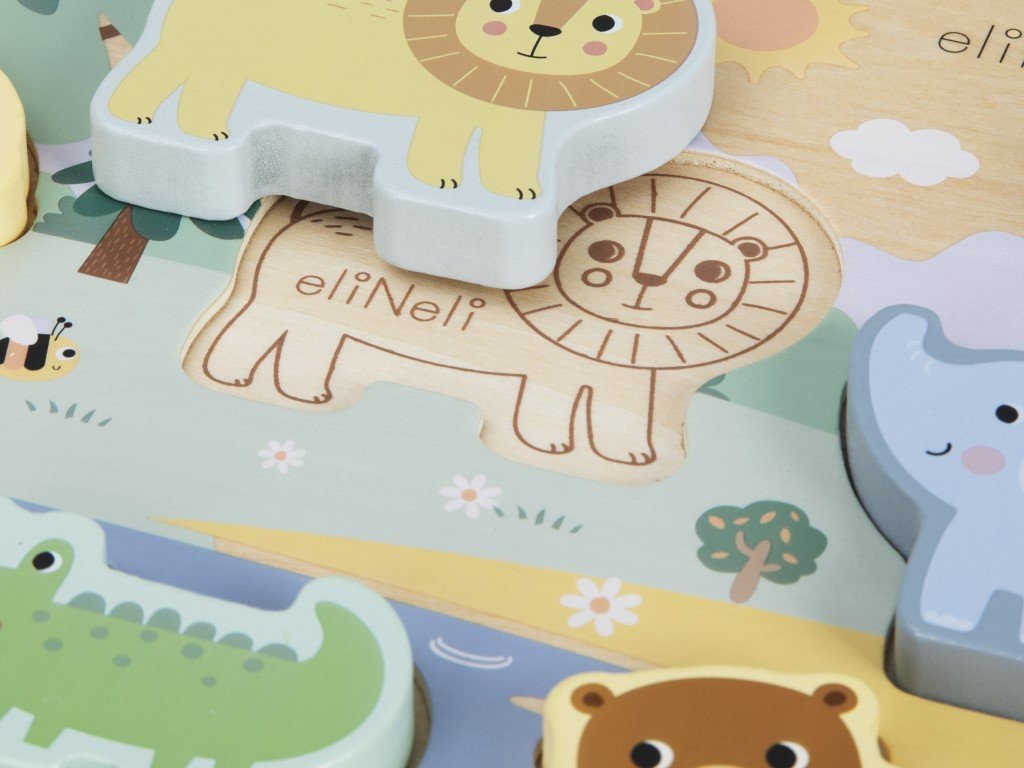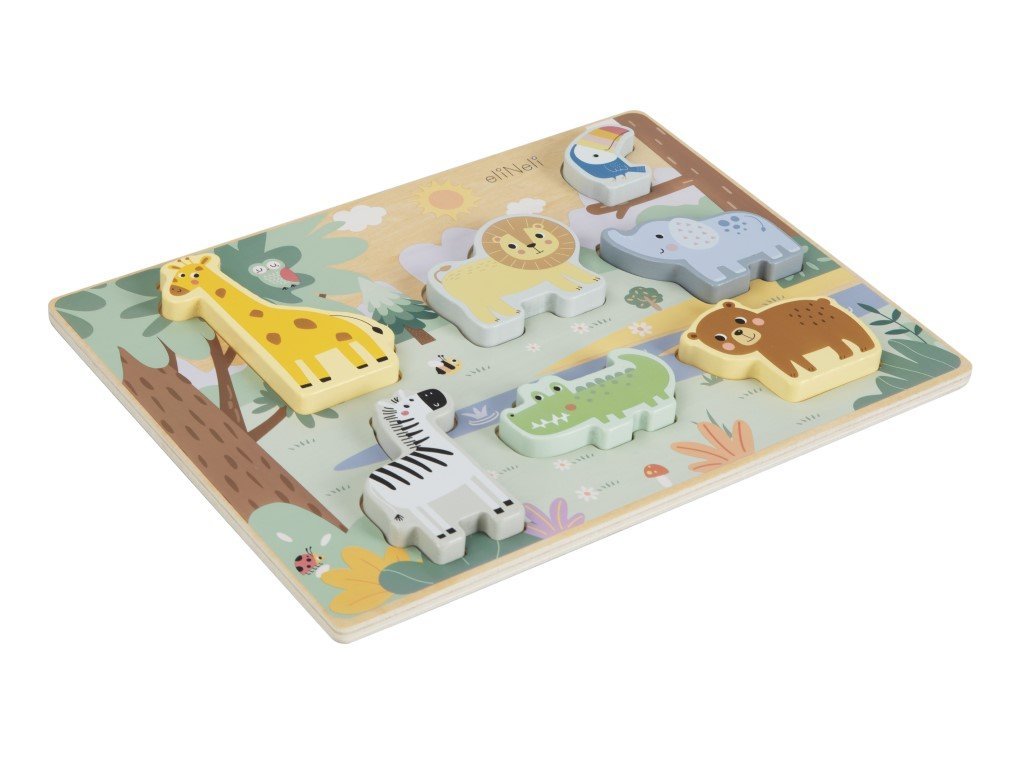 - Népszerű motívum - az állatkerti állatok formájú fa puzzle-darabkákkal ellátott játéktábla motiválja a gyerekeket a játékra.