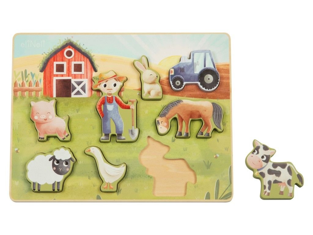 A kedvenc farmállatokkal ellátott fa kirakós játék 1 éves kortól szórakoztatja a gyerekeket. Az aranyos fa állatok – ló, tehén, malac, bárány, nyuszi és liba – elviszik a gyerekeket a farmra, ahol játék közben gyakorolhatják finom motorikus képességeiket, koordinációjukat és képzelőerejüket. Ugyanakkor megtanulják felismerni a haszonállatokat, a színeket és akár a méretbeli különbségeket is. Ahhoz, hogy minden állatka a helyére illeszkedjen, a gyerekeknek gondolkodniuk, próbálkozniuk és forgatniuk kell a darabokat, ami fejleszti logikai gondolkodásukat és türelmüket.