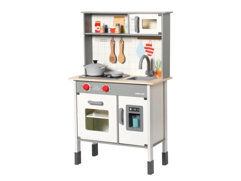 A hagyományos és modern készülékekkel és berendezésekkel felszerelt gyermekkonyha lehetővé teszi a gyermekek számára, hogy biztonságos módon próbálják ki a felnőtt tevékenységeket. A főzés, a sütés és a mosogatás nagyon szórakoztató lehet, különösen, ha minden ebben a stílusos kiskonyhában történik. Emellett a gyermekkonyha eredeti, modern kiegészítőjével, a jégkockakészítővel (jégkészítővel) is rendelkezik. Amikor a konyhában játszanak, a gyerekek szabadon engedhetik a fantáziájukat, sokat szórakozhatnak és természetes módon fejleszthetik készségeiket. A konyhapulton található gombok megnyomása után a melegítőkorongok világítanak és főzést imitáló hangot adnak ki.