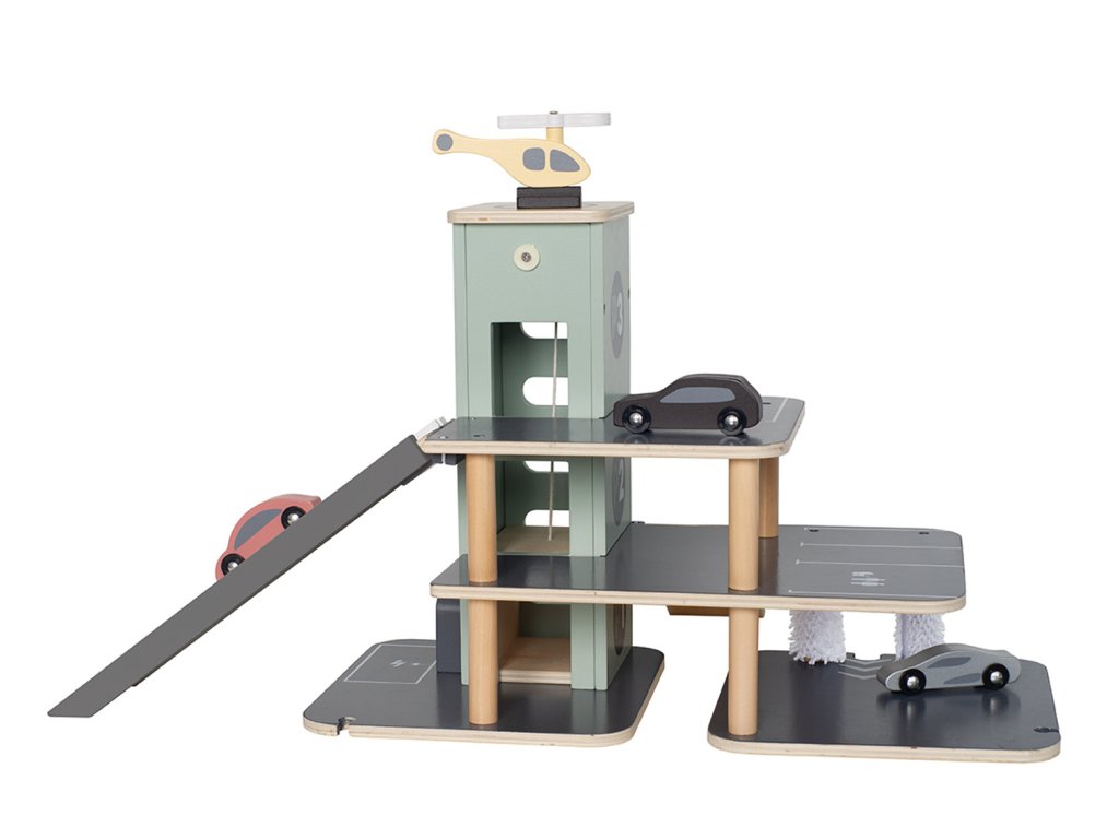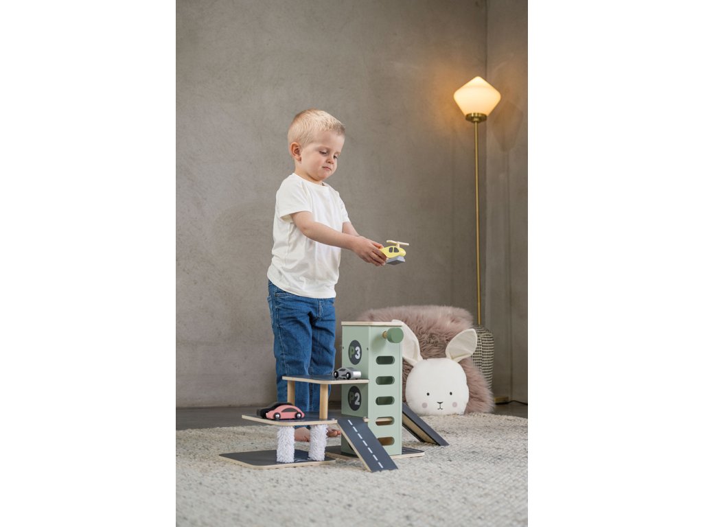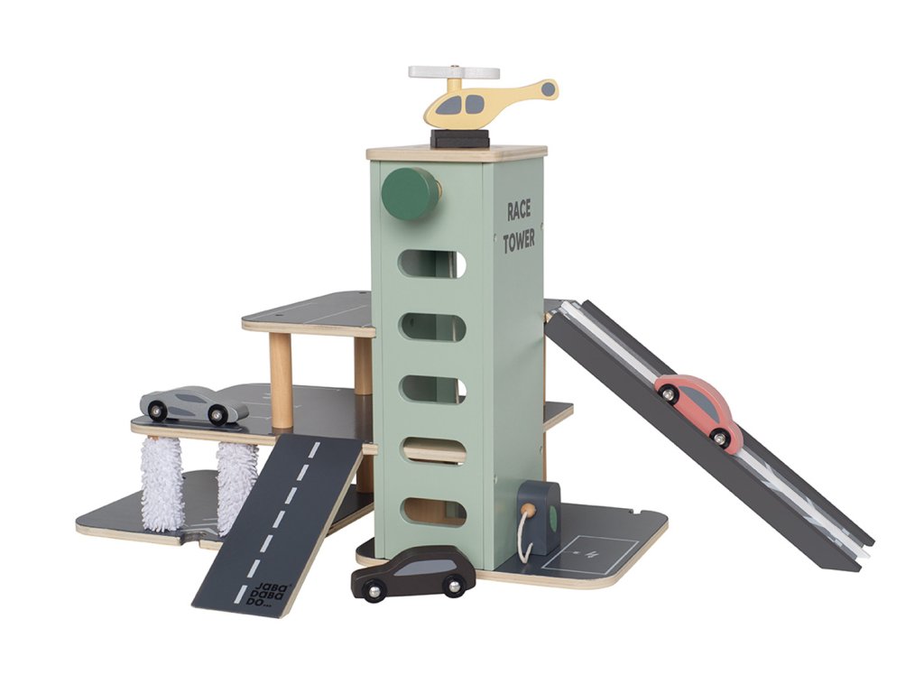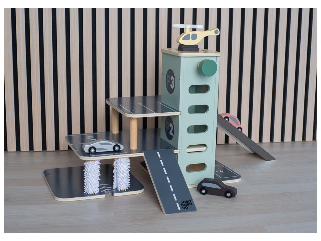 A parkolás és az autós játék a garázsban nagy szórakozás, amelyet még egy szinttel feljebb lehet emelni. A garázshoz tartozik egy versenypálya, amelyen a gyerekek versenyeket rendezhetnek. A versenyautókkal a versenypályán megkezdődhetnek a versenyek, mivel kényelmesen elfér rajta 2 autó egymás mellett. A gyerekek folytathatják a játékot az alsó szinten, ahol feltöltik az autókat üzemanyaggal vagy feltöltik az akkumulátorokat, és megmoshatják őket a mosóban. A magasabb szintekre az autók rámpákon haladhatnak fel, vagy lifttel szállíthatók fel. A lift kezelése egyszerű, csak a vezérlőkeréket kell forgatni. A háromszintes garázs tetején türelmetlenül vár egy helikopter, amely a gyerekszobában szeretne repülni. A garázsban a gyerekek rengeteg parkolóhelyet találnak, ahol a kocsikat leparkolhatják és pihenhetnek, amikor éppen nem játszanak velük. A fa garázzsal a gyerekek órákon át játszhatnak, sok szórakozásban részesülnek és fejleszthetik készségeiket. A garázs kompatibilis az összes JaBaDaBaDo játékkal, amely síneket tartalmaz. A többszintes garázs elősegíti a kreatív játékot és tökéletes születésnapi ajándék.
