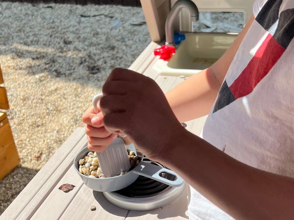 - Konyhaszekrény - a gyerekeknek szánt kerti házhoz tartozik egy mosogató az edények számára és egy főzőtűzhely, azaz egy konyhaszekrény.