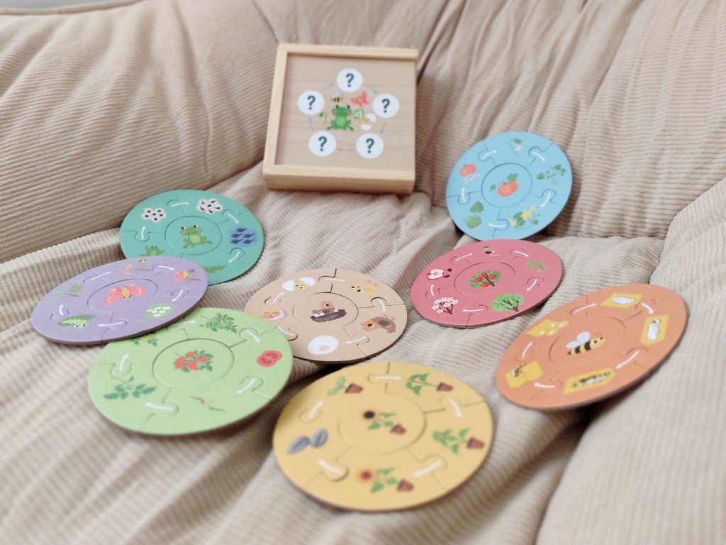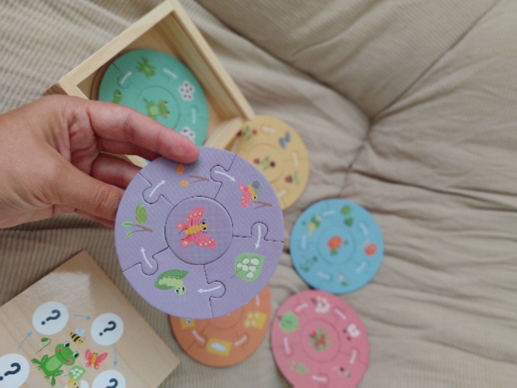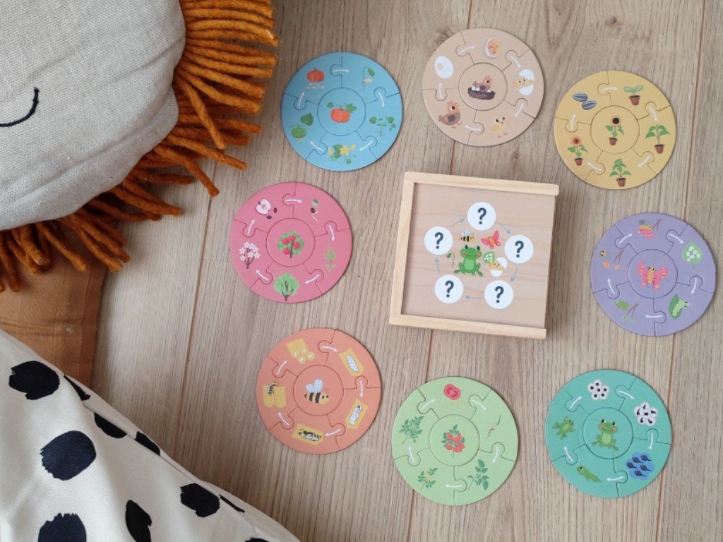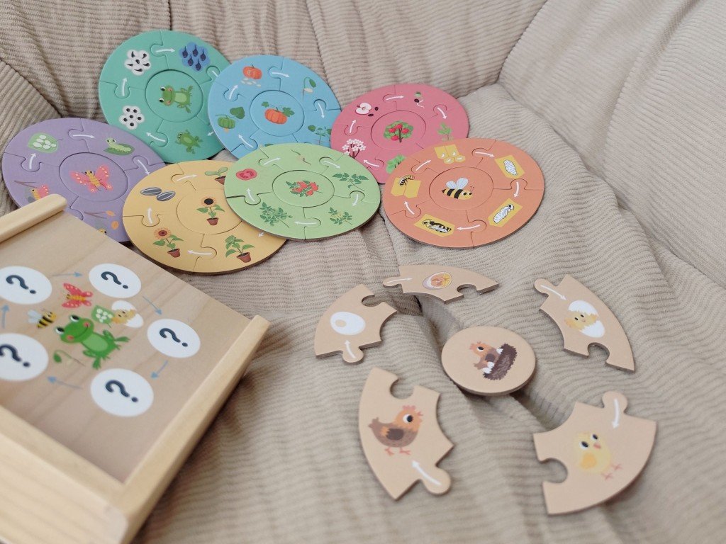 A növények és állatok életciklusának eredeti motívumával ellátott fa puzzle csodálatos játék lesz a 3 éves gyermekek számára. Nyolc kör alakú, hat darabból álló kirakós játék megismerteti a gyerekeket a növények és állatok életciklusával, az elejétől a végéig. Mindazt, amit a gyerekek összerakás közben megtanulnak, később a szabadban, például egy séta alkalmával, a kertben vagy a nagymamánál töltött vakáción együtt is megfigyelhetik. A gyerekek nemcsak a méh, a béka, a pillangó, a madár, a napraforgó, az almafa, a tök és a paradicsom életciklusának elvét és életciklusát fogják megérteni, hanem elkezdik észrevenni a környezetükben lévő növények és állatok változásait is.