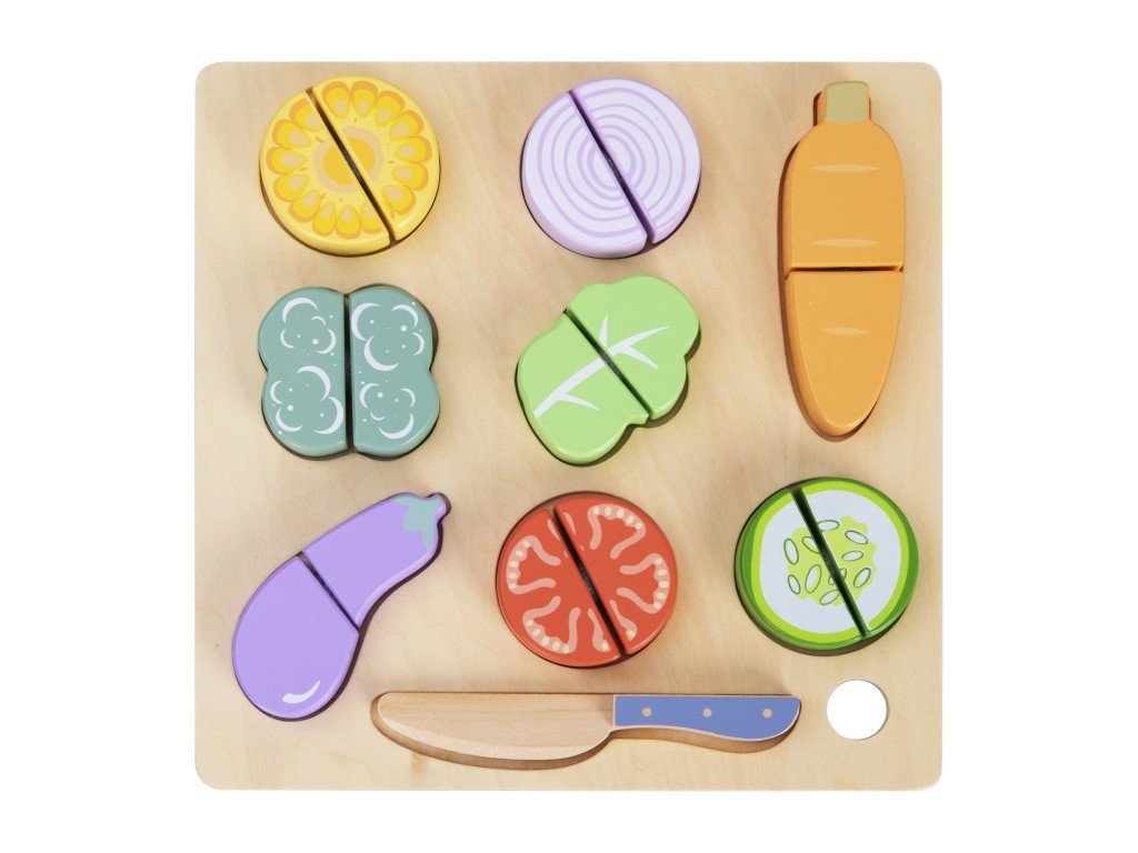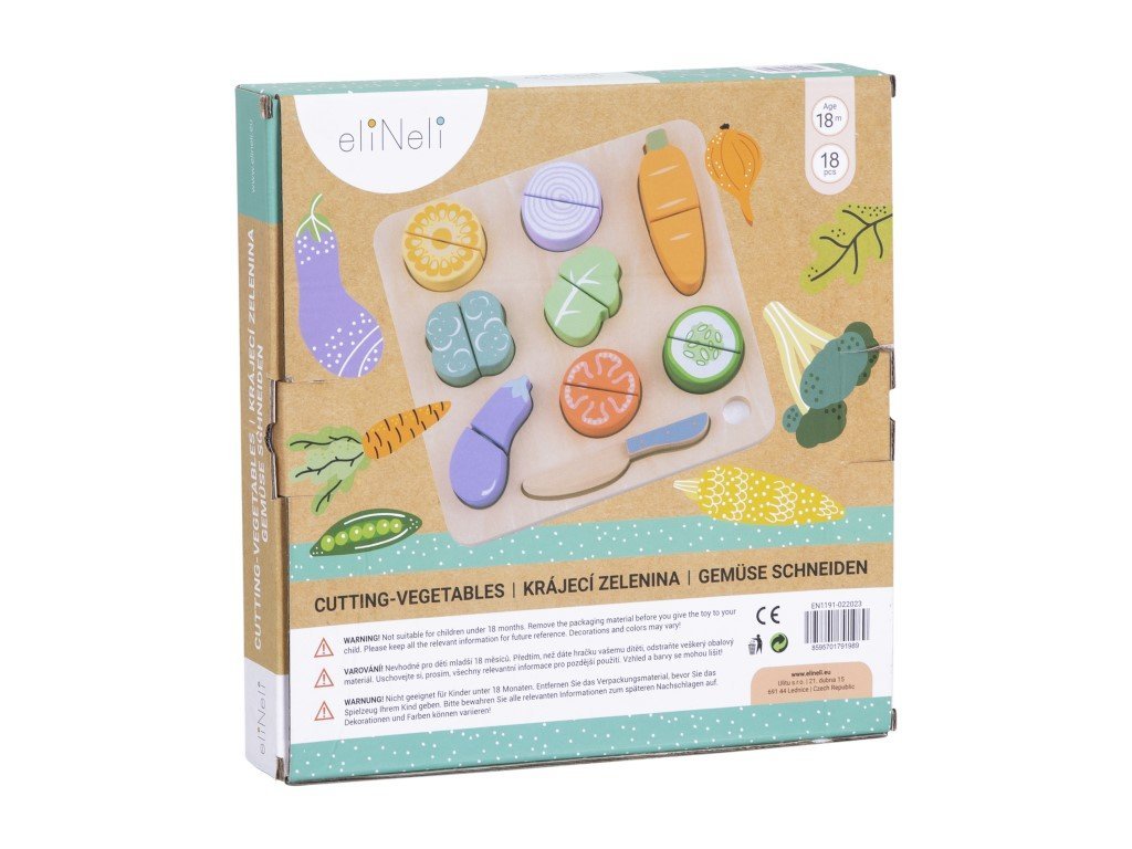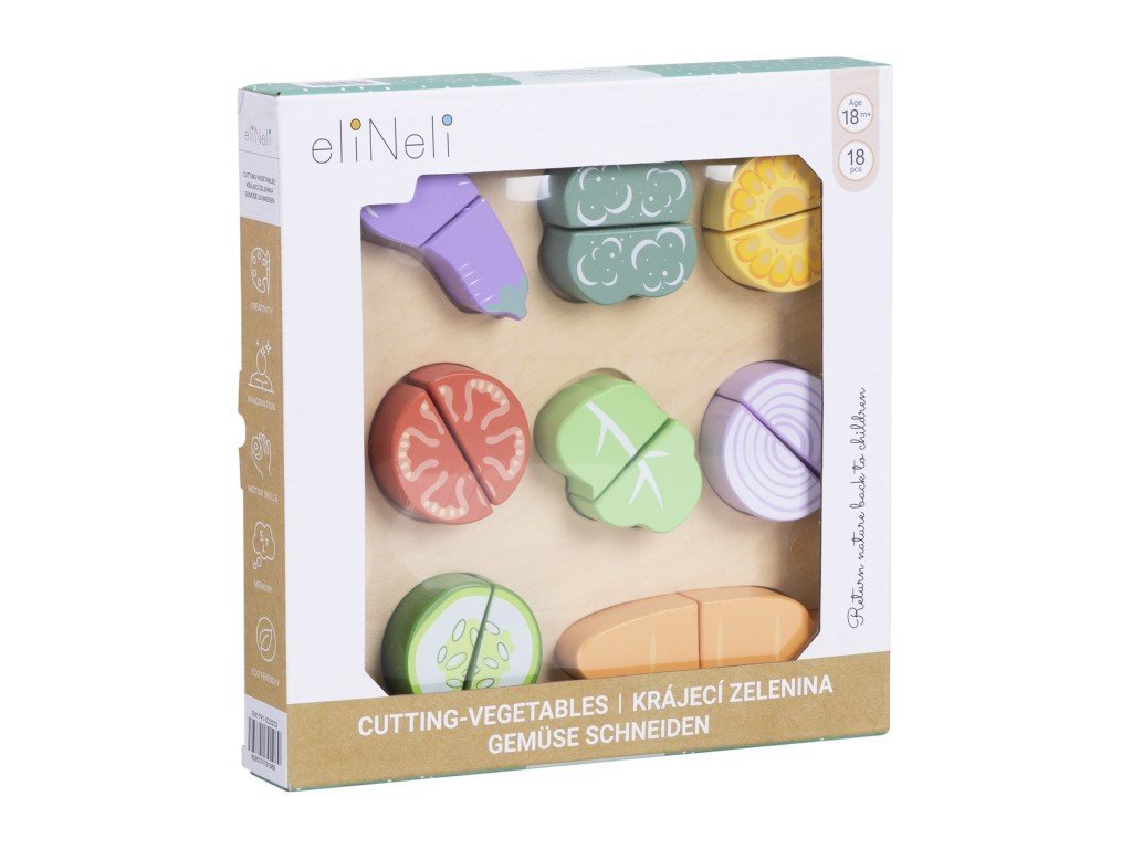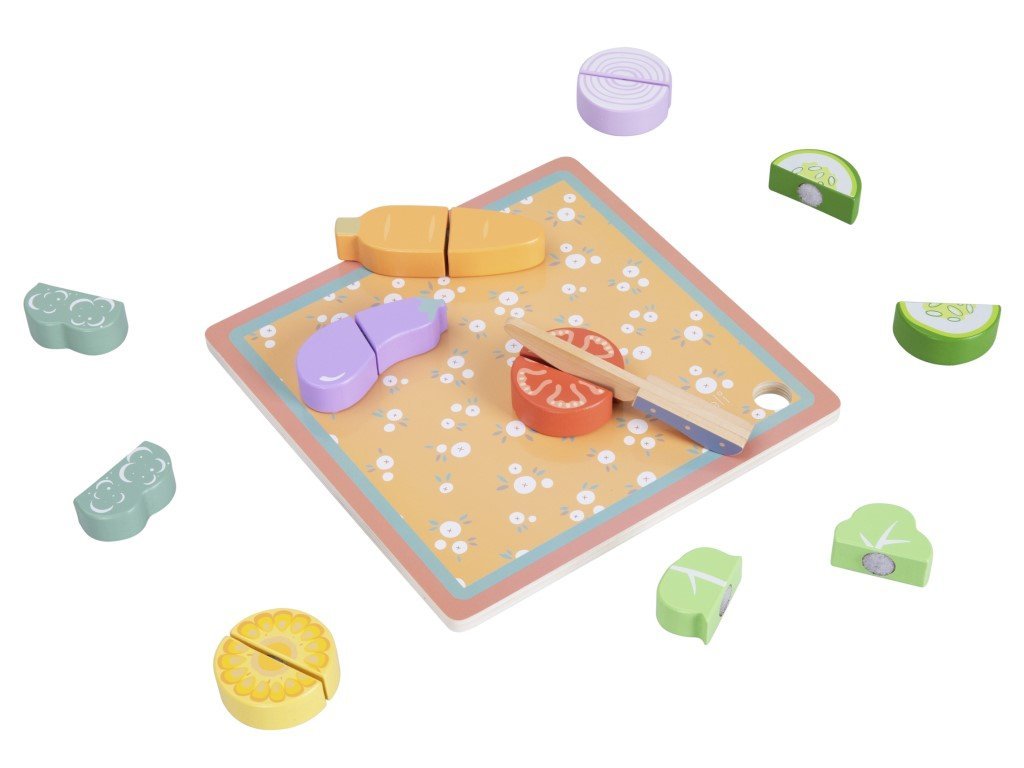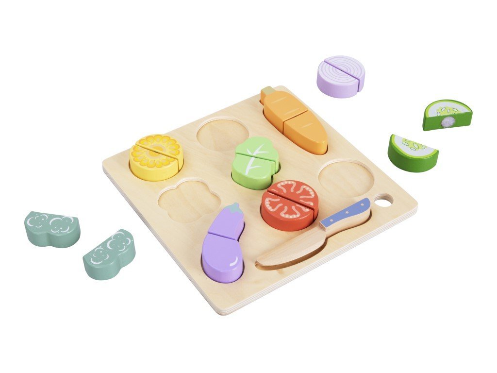 A fából készült zöldségek nagyszerű kiegészítői a gyermekkonyháknak, standoknak és a boltoknak. A szeletelhető zöldségekkel a gyerekek belevághatnak a főzésbe, reggelit vagy rágcsálnivalót készíthetnek kedvenc játékaiknak, barátaiknak és szüleiknek. Kilenc zöldség, amelyet a gyerekek a kertből, otthonról vagy a boltból ismernek, félbe vannak osztva, amelyeket csak tépőzár tart össze. Elég a kezükbe venni fakést és felszeletelni a zöldségeket. A készletben egy gyönyörű vágódeszka, valamint egy fakés is található. A szeletelhető zöldség egy népszerű gyermekjáték, amely lehetővé teszi a gyermekek számára, hogy biztonságos, gyermekbarát módon próbálják ki a késsel való szeletelést.