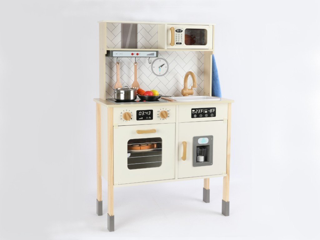 - Készülékek – a gyerek konyha a szükséges készülékekkel van felszerelve: tűzhellyel, sütővel, jégkészítővel, mikrohullámú sütővel és elszívóval.