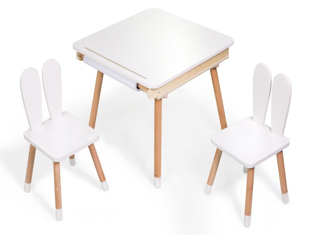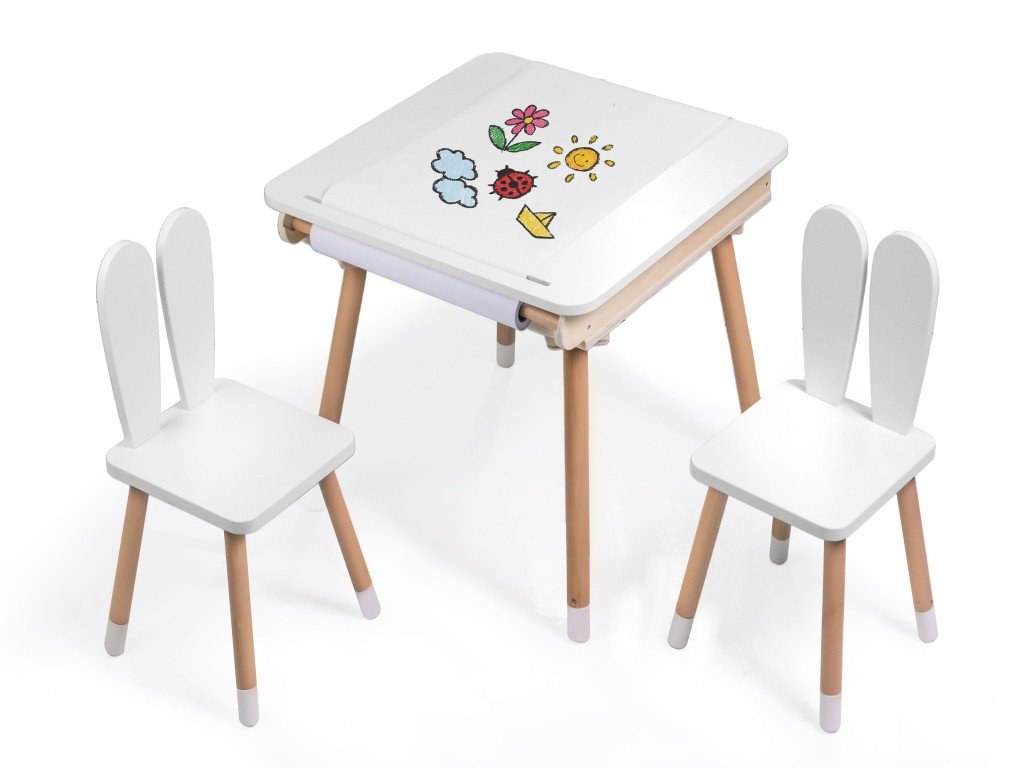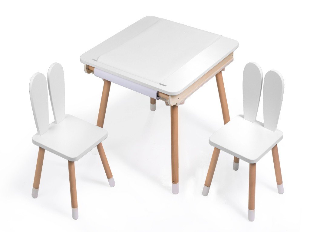A növekvő asztal és két szék aranyos fülekkel ötvözi a játékosságot, a praktikumot és a kortalan stílust. A design gyerekbútor-szett, amely fiúknak és lányoknak egyaránt alkalmas, a gyerekekkel együtt növekszik az első rajzoktól és alkotásoktól egészen az iskolai feladatokig. A bútorok hosszabbító elemekkel 1-12 éves gyermekek magasságához és igényeihez igazodnak. A csomagban 3 db kiegészítő csavarozható láb található, amelyekkel az asztal és a székek 5 vagy 10 cm-rel megemelhetők.