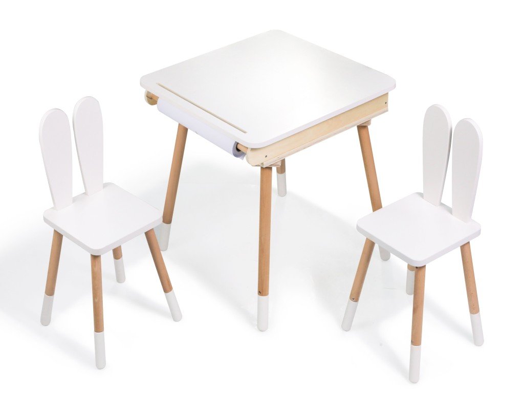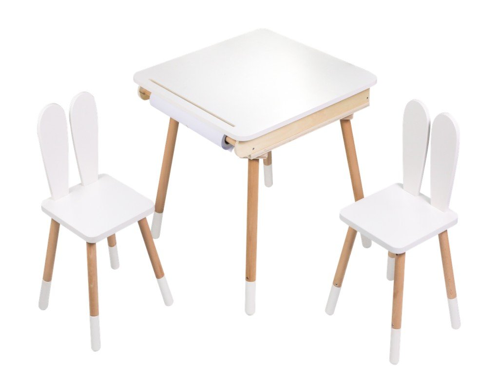 A bútorok kiváló minőségű természetes bükkfából készültek, fehér színnel kombinálva, ami finomságot és eleganciát kölcsönöz a belső térnek. A nyúlfülek időtálló kialakítása nemcsak a gyerekszobába, hanem a játszósarokba, a dolgozószobába vagy a nappaliba is jól illeszkedik. A stabil szerkezet és a biztonságos felületkezelés garantálja a kényelmes és biztonságos használatot.