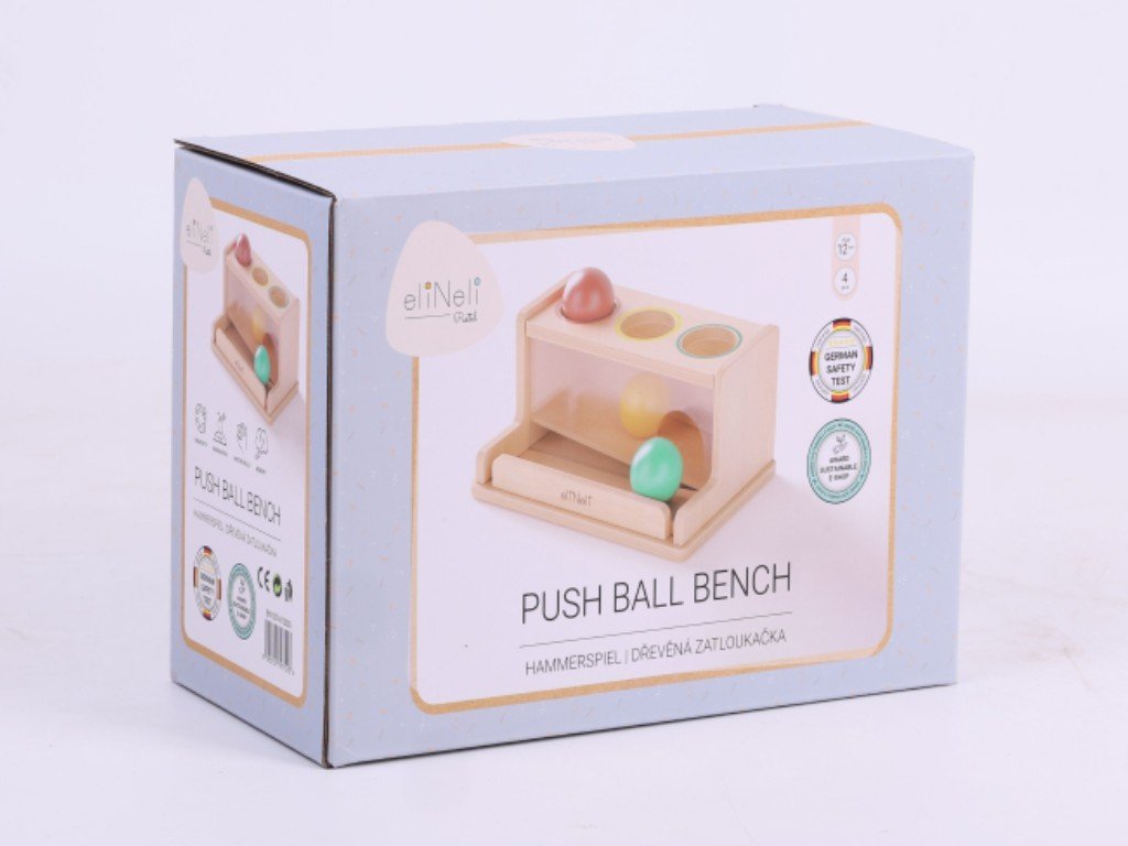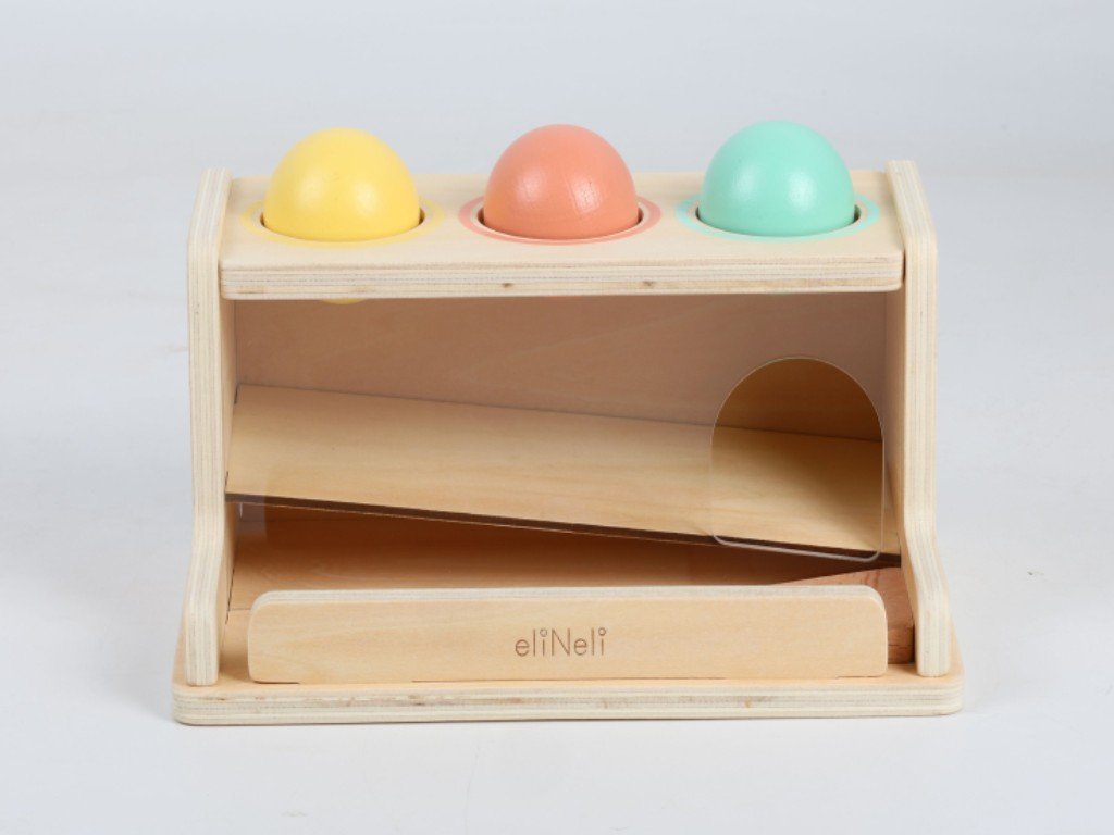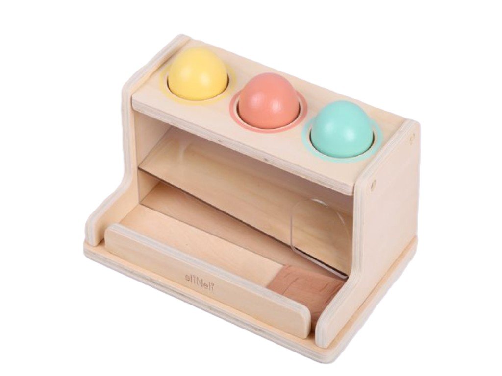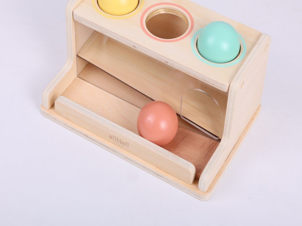 - Átlátszó rész – a vizuális hatás, amelynek köszönhetően a gyerekek láthatják a golyók útját a doboz belsejében, növeli az érdeklődést a tevékenység ismétlése és a motorikus képességek gyakorlása iránt.