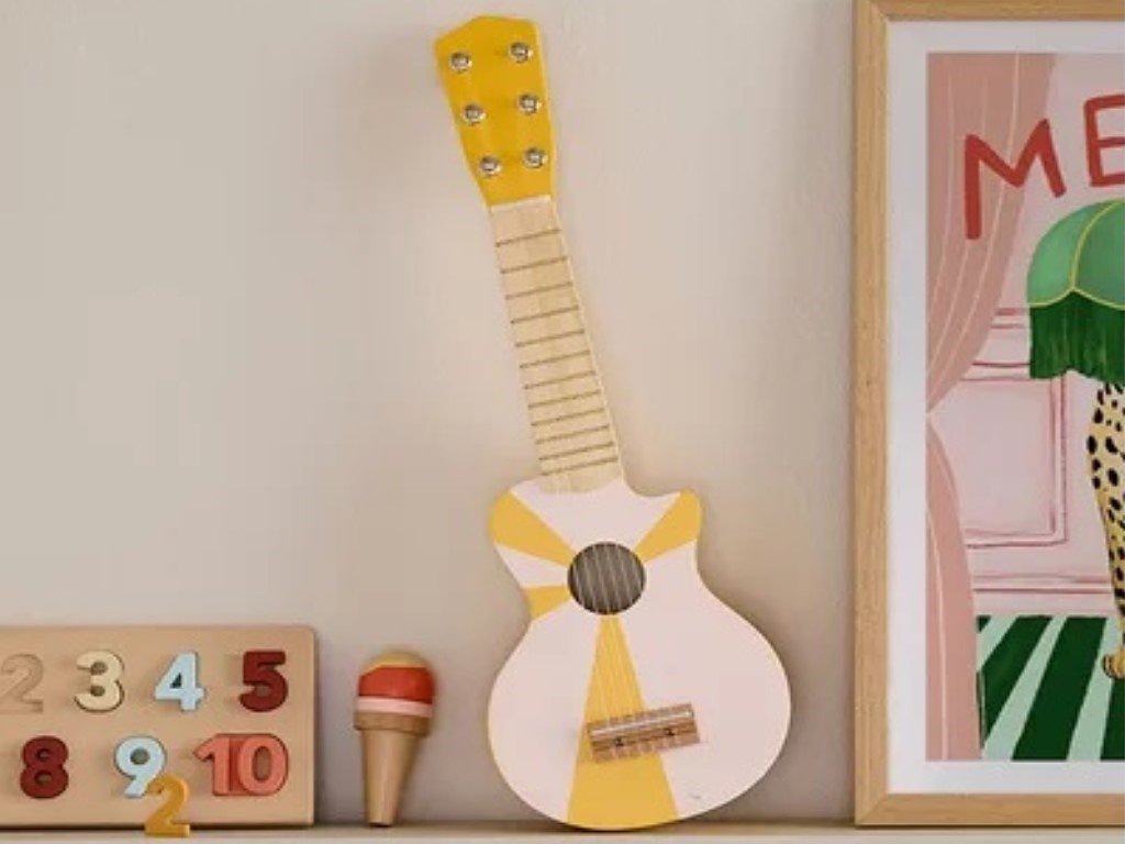 A sárga-fehér színű fa gyermekgitár ideális játék minden kis zenekedvelő számára. A játék szórakoztató lesz a kislányok és fiúk számára, és emellett fejleszti a motorikus képességeiket is. Amint kicsit megnőnek, talán érdeklődni fognak egy igazi hangszer iránt. Mi lenne, ha koncertet szerveznének a barátaiknak vagy a nagyszüleiknek? Az ilyen eseményre való felkészüléssel kellemes időt tölthetnek együtt.