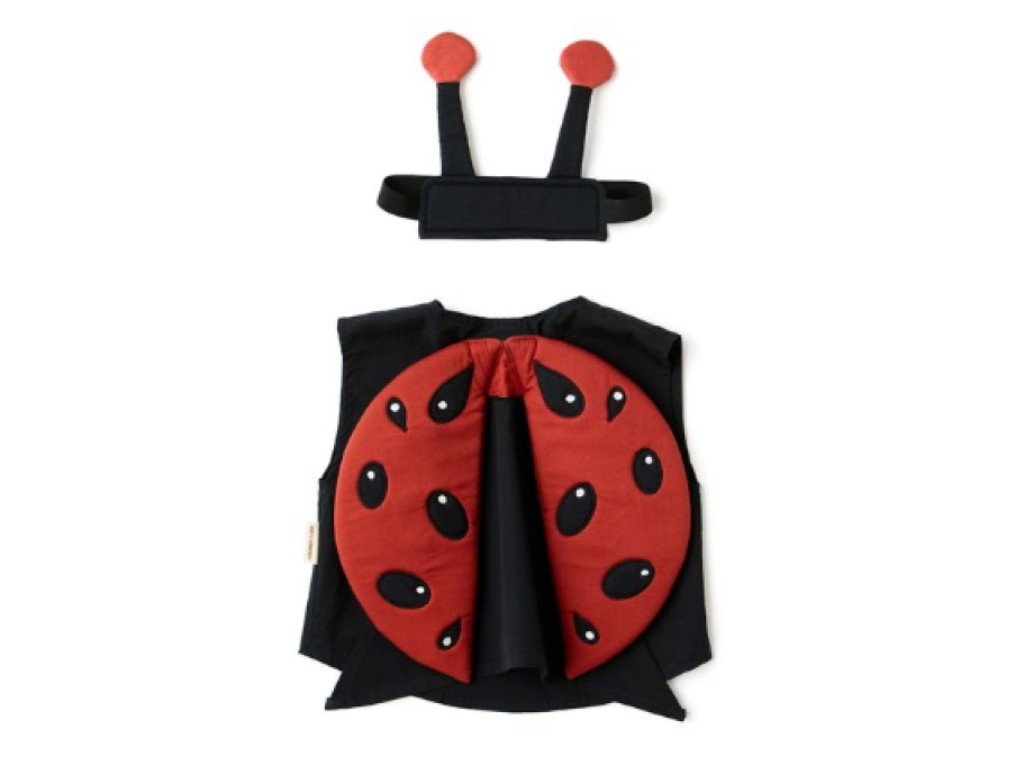 A puha fekete mellényt párnázott, piros katicaszárnyak díszítik, amelyet egy csápokkal ellátott fejpánt egészít ki. A mellény tépőzárral záródik, így az öltözködés gyors és kényelmes.