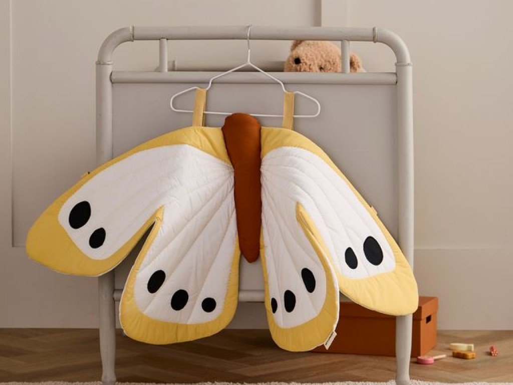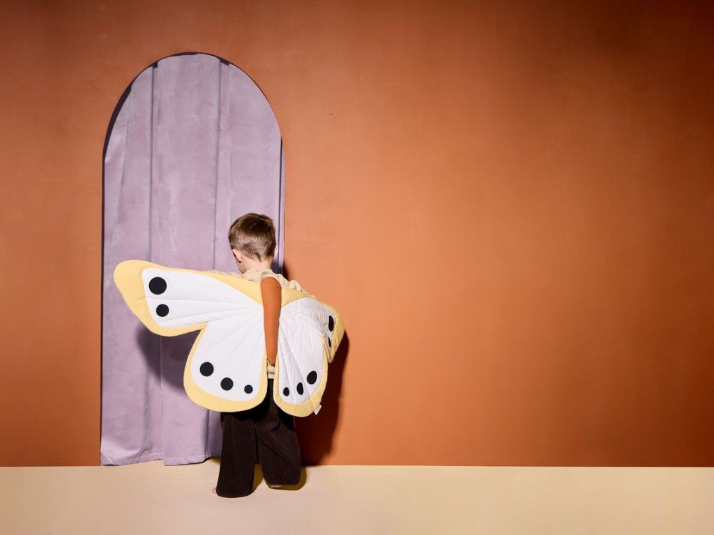 A szárnyak könnyű, enyhén steppelt anyagból készültek, amely szépen tartja a formáját, a hímzett részletek pedig még látványosabbá teszik őket. A szárnyak rugalmas pántokkal rögzíthetők, így a gyerekek könnyedén felvehetik, és elegánsan utánozhatják a pillangók szárnycsapásait.