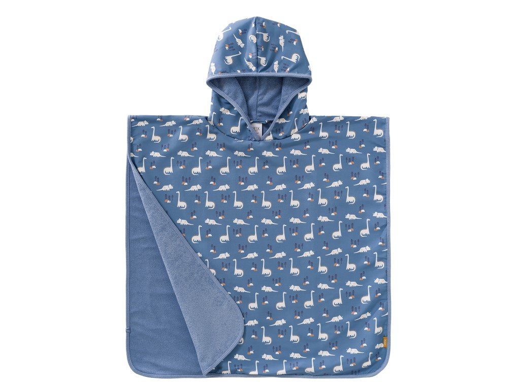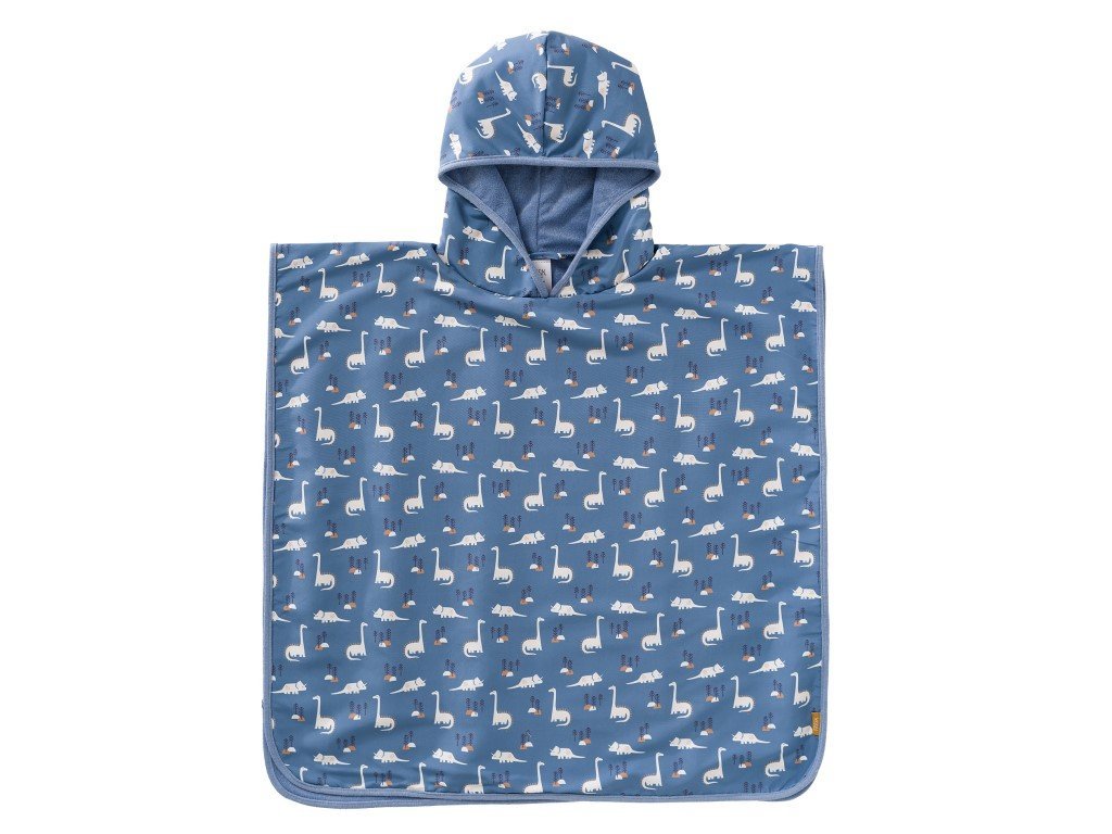 A kék színű, kapucnival és a népszerű dinoszaurusz motívummal rendelkező gyermekponcsó ideális kiegészítő a vízhez és a strandra. A kényelmes poncsót törölköző vagy fürdőlepedő helyett is használhatja, hogy a vízi játék után megszárítsa a gyermeket, vagy UV ruhaként, hogy megvédje gyermeke bőrét a napsugaraktól. A dinoszaurusz motívumú, UV-szűrővel ellátott poncsó lehetővé teszi a gyermekek számára, hogy teljes mértékben élvezzék a nyári játékot és szórakozást. Az újrahasznosított nejlonból készült kék kapucnis poncsó szárazon és melegen tartja a gyerekeket egy vidám vízben való hancúrozás után.