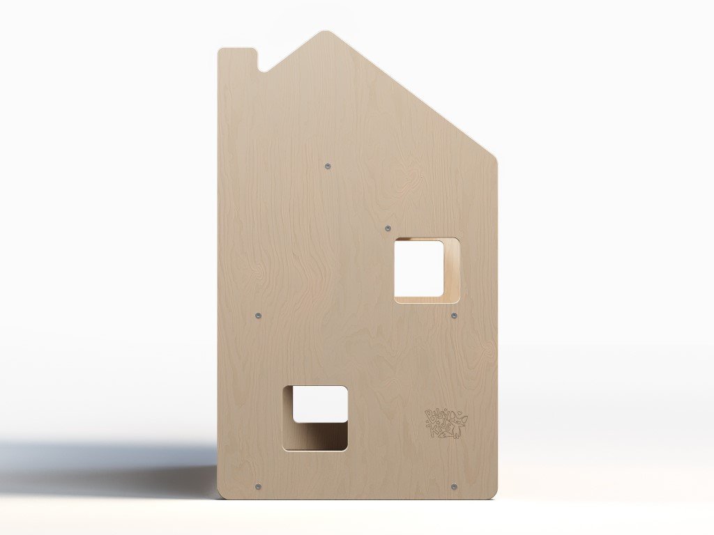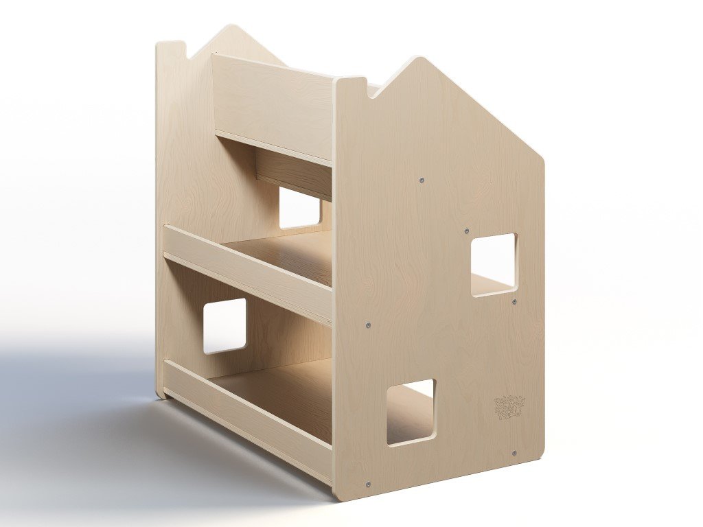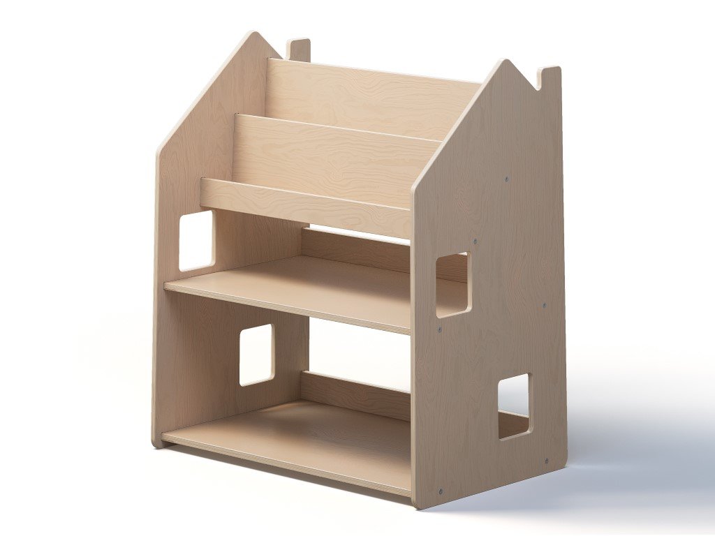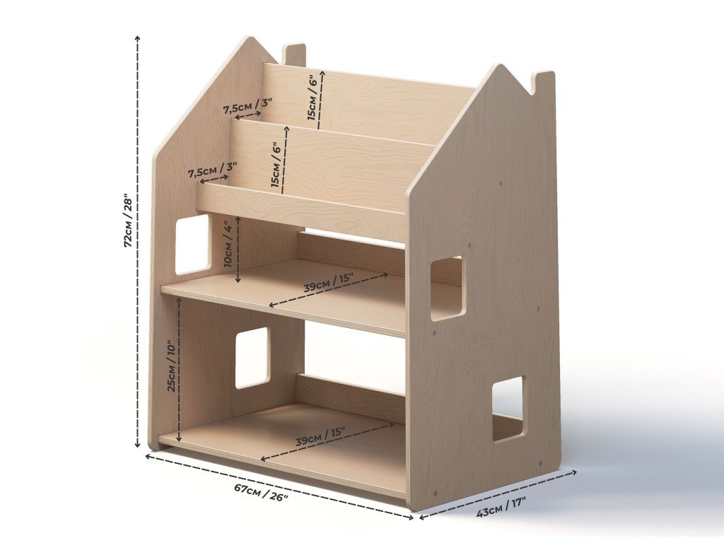A 2 az 1-ben gyermekkönyvtár egy dizájnos bútordarab a gyerekszobába, amely könyvespolc és polcrendszer egyben. A ferde tetős könyvtár, amely könyvespolcokból, polcokból, ablakokból és kéményből áll, a gyerekek és a szülők kedvence lesz. A könnyen hozzáférhető tárolóhelyek, amelyek ideálisak a kedvenc könyvek és játékok tárolására, önállóságra ösztönzik a gyerekeket a választás, a szervezés, a játék és a takarítás terén, ami összhangban van a montessori módszerrel. A könyvespolc és a polc ház formájában azonban másra is használható – lehet babaház is. A sokoldalú felhasználás lehetővé teszi a gyerekeknek, hogy szabadjára engedjék fantáziájukat, és minden nap másképp használják a könyvespolcot. A szilárd és stabil könyvespolc kiváló minőségű nyírfa rétegelt lemezből készült, felülete átlátszó, vízzel hígítható lakkal van kezelve, amely gyermekek számára is megfelelő és biztonságos. Természetesen a felület simára csiszolt, az élek lekerekítettek.