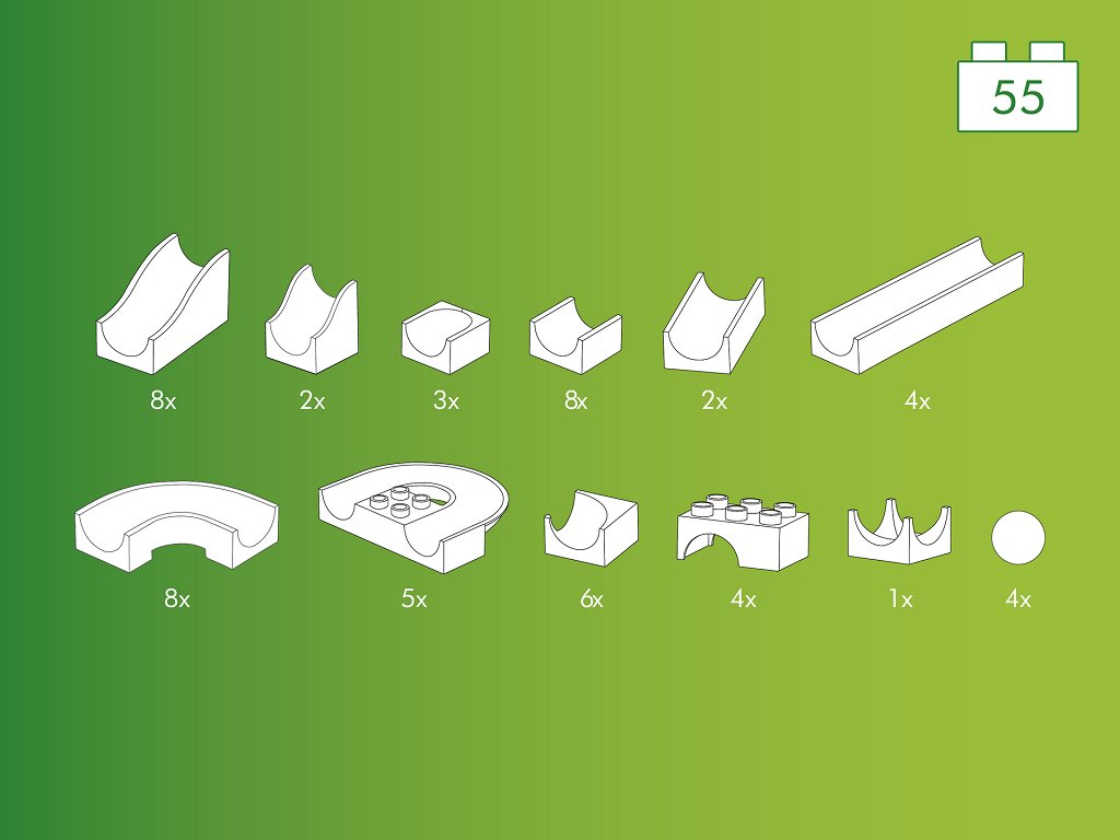 - A csomag tartalma: 55 db (51 építőelem, 4 golyó), útmutató