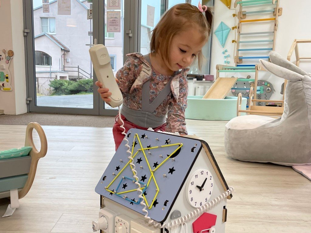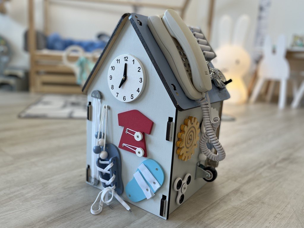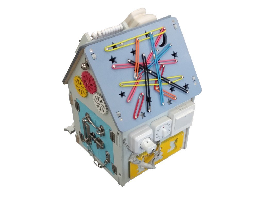 Az interaktív házzal a gyerekek nagyon jól fognak szórakozni, miközben fejlesztik képességeiket és természetes módon tanulnak új készségeket. A ház minden fala és a tető egy része eredeti. Az interaktív elemek között megtalálhatóak a különböző zárak, kapcsolók, órák, golyószámláló, didaktikus gumiszalag játék, cipőfűző, gyöngyök, cipzár, fogaskerekek. A gyerekek kézefoghatják, felfedezhetik, kipróbálhatják, hogy mi hogy működik. Ezáltal nemcsak játszanak, hanem az egész mozgásszervi rendszert és érzékszerveket, de az elmét is fejlesztik. Az Activity board házikó egyedülálló a tetőbe mart csillagokkal és félholddal. Csak várjon sötétedésig, helyezzen el egy lámpát a házba, és a gyerekszoba mennyezete csillagokkal tarkított éjszakai égbolttá változik.