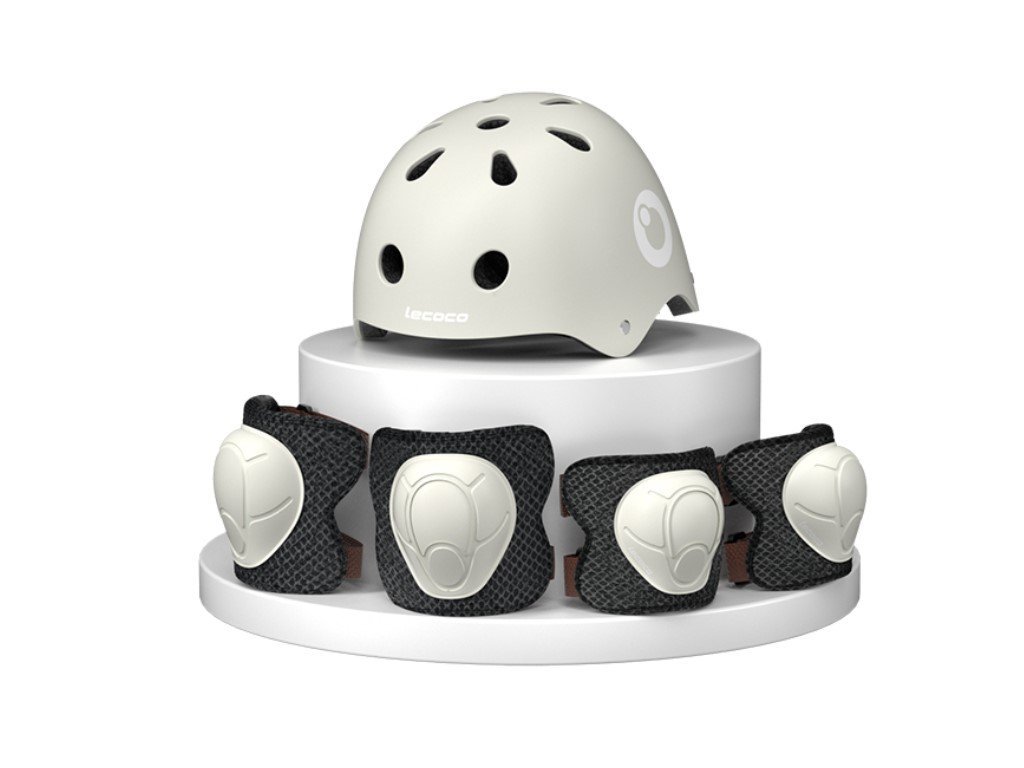 A védőfelszerelés és a sisak nélkülözhetetlen biztonsági elem, amely megvédi a gyermek fejét, könyökét és térdét esés esetén, amikor rollerezik, kerékpározik vagy görkorcsolyázik. A semleges fehér kialakítás fiúknak és lányoknak egyaránt megfelel, és színe bármilyen kerékpárhoz illik. A készletet 1 és 4 éves kor közötti gyermekek számára tervezték.