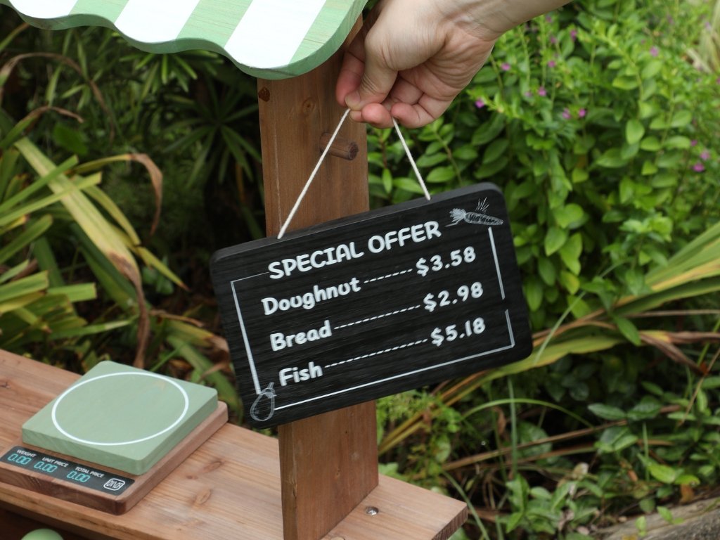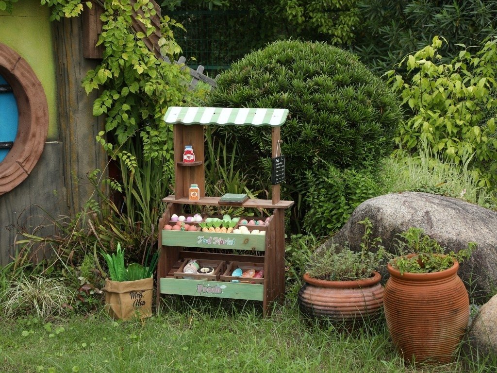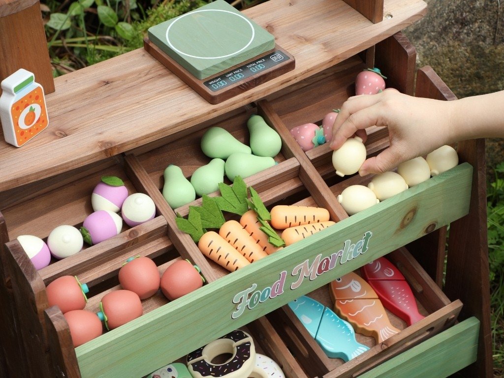 Az MDF-fel kombinált tömör fenyőfa nagy stabilitást, kültéri használatnak való ellenállást és hosszú élettartamot biztosít. A rengeteg tartozék, köztük gyümölcsök, zöldségek, desszertek, halak, tépőzáras sütő, mérlegek és árcédulák lehetővé teszik a valósághű bolti játékot, és bővítik a felhasználási lehetőségeket.