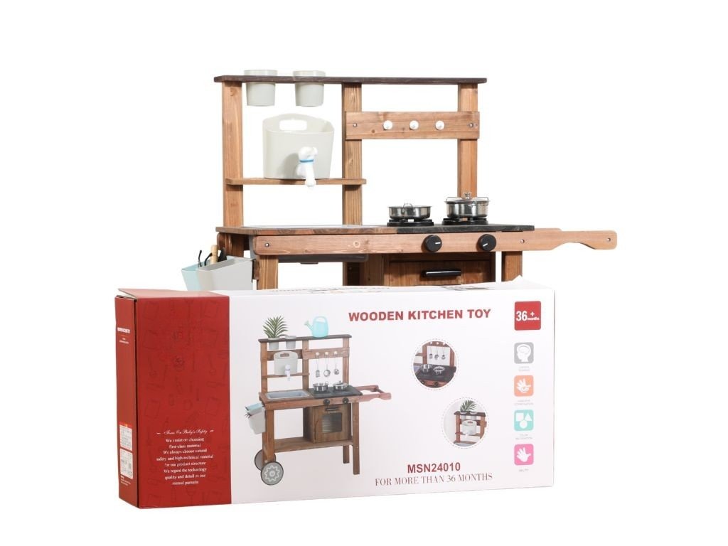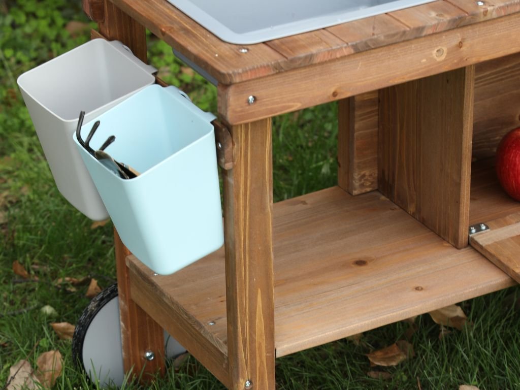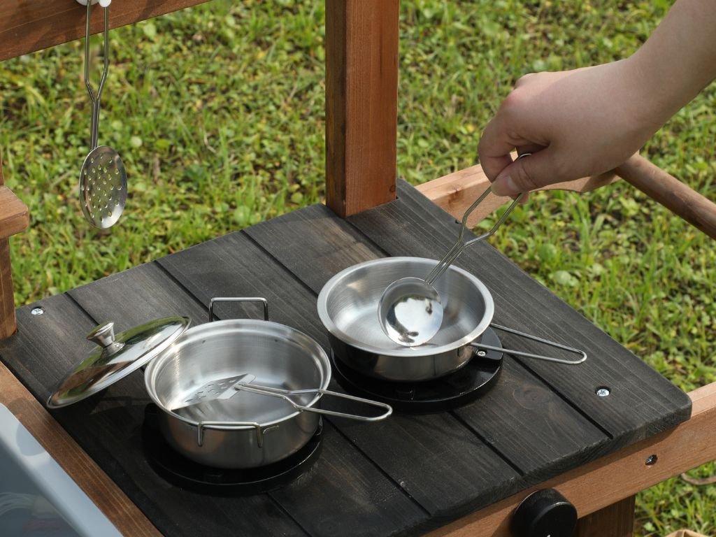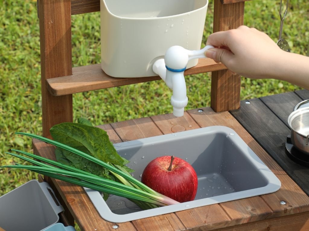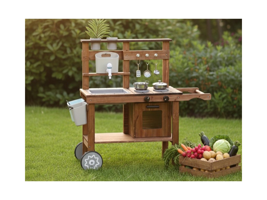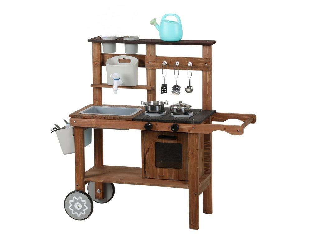 A könnyen mozgatható, kétkerekű konyha számos tartozékkal, például edényekkel, serpenyőkkel és vizes mosogatóval rendelkezik, hogy a gyerekek valósághű főző- és mosogatójátékot játszhassanak. A csomagban cserepek és egy öntözőkanna is található, hogy természetesen bővítse a növények gondozásának játékát.