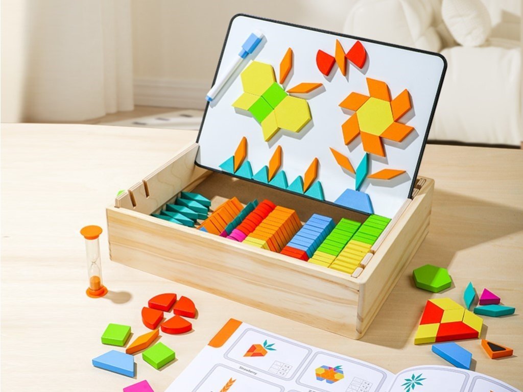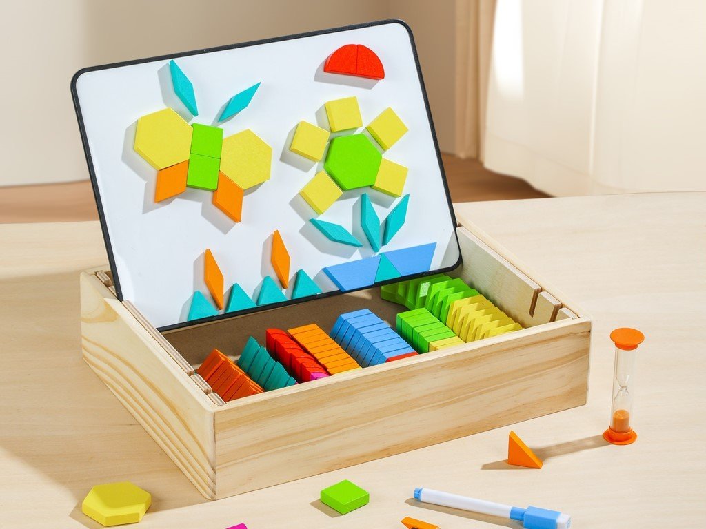 A fából készült mágneses tangram játék egy fadobozba rejtett szórakoztató és tanulságos játék. Maga a doboz fedele egy mágneses tábla, amelyen a gyerekek saját fantáziájuk vagy tervük szerint képeket és mintákat alkothatnak. A gyönyörű színekben pompázó fadarabok játékra motiválják a gyerekeket, és motiválják őket a színek, a geometriai formák és még az alapvető számtani ismeretek elsajátítására is. A gyermekek által maguk által készített virág szirmainak megszámlálása vagy egyszerűen csak a háromszögek, négyzetek és sokszögek számolása lehetővé teszi a gyermekek számára, hogy szórakoztató módon tanuljanak. A mágneses kirakóval játszva a gyerekek fejlesztik a motoros készségeket, a szem-kéz koordinációt, fejlesztik a kreativitást és a képzelőerőt, megtanulják felismerni a színeket, a formákat és számolni. A játék megnehezítése érdekében homokórával visszaszámolhatja az időt, amíg a gyerekek teljesítik a feladatot. A praktikus csomagolásnak köszönhetően a játék gyorsan elpakolható és könnyen hordozható. A gyerekek magukkal vihetik barátlátogatásra, nagymamához és nyaralásra is.