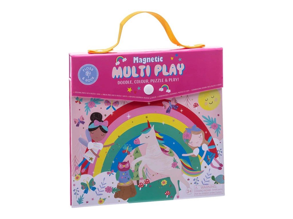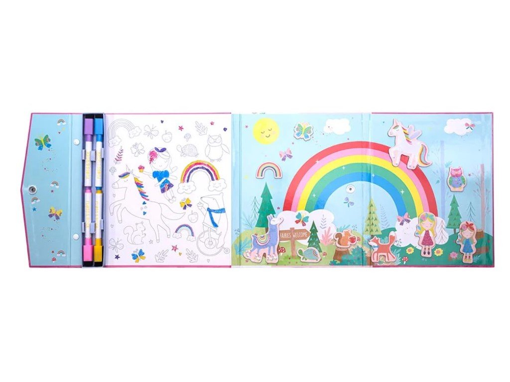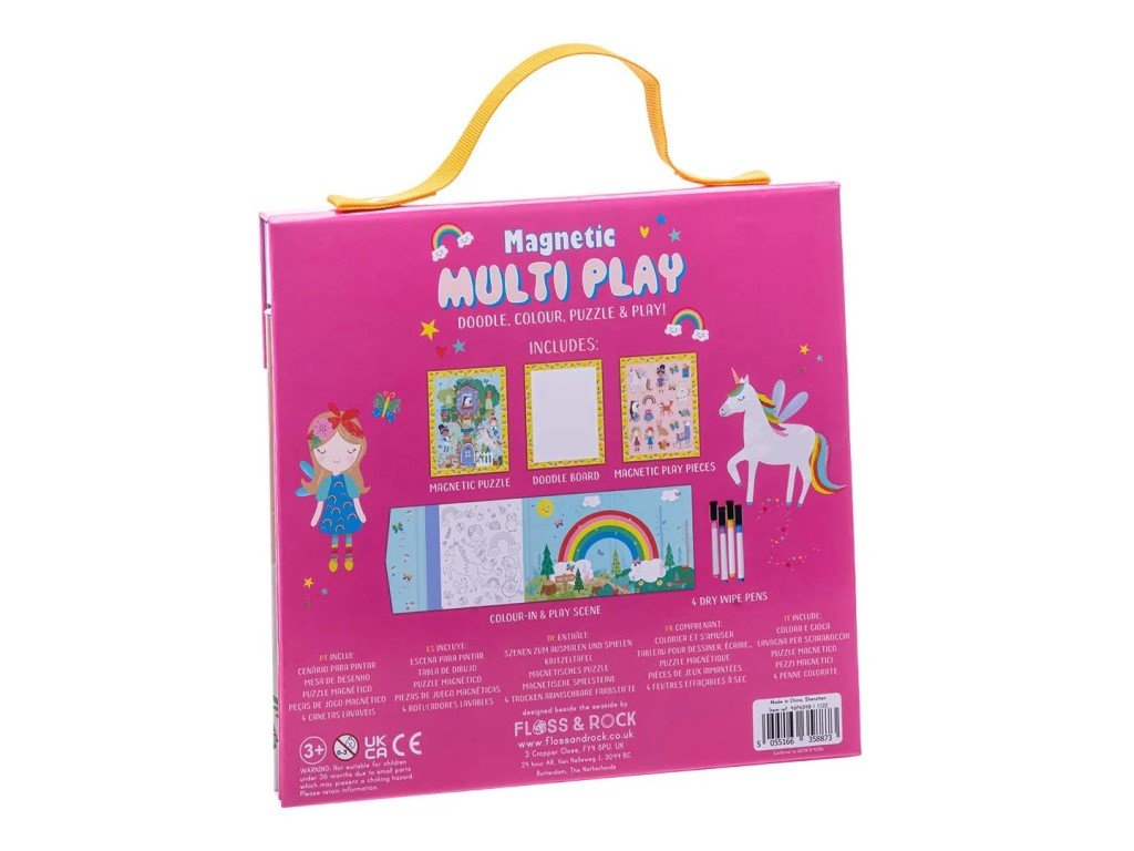A multifunkcionális 4 az 1-ben mágneses játék praktikus és könnyen hordozható dobozban 4 szórakoztató tevékenységet rejt magában a kislányok számára. Azok a tevékenységek, amelyek szórakoztatják a gyerekeket, fejlesztik a készségeiket. A 20 darabos mágneses puzzle segítségével a kislányok összeállíthatják a mesebeli világot tündérházzal, aranyos állatokkal és kedves tündérekkel. A 4 színes filctoll segítségével a kislányok kifesthetik a mesebeli figurákkal ellátott képet, vagy saját képet festhetnek a táblára, amelyet újra és újra le lehet törölni és újra festeni. A mesebeli figurák és állatok formájú mágnesek a szivárványos világban való játékra lettek kitalálva, amely teljesen mágneses.