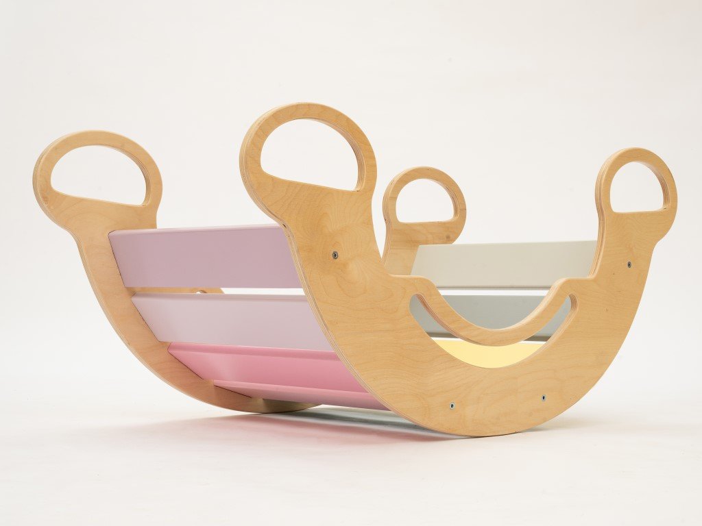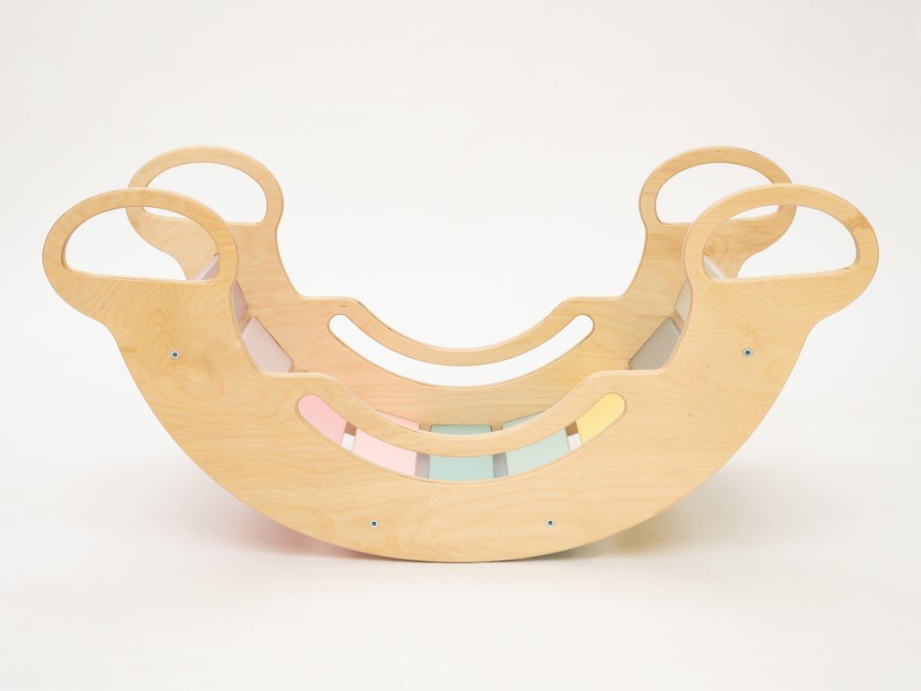 A széles mosoly alakú oldalsó fogantyúk biztonságot jelentenek még a legkisebb gyerekeknek is és a felső fogantyúk biztosítják a hinta stabilitását. Az oldalt kivágott fogantyúk nem lógnak ki, így még nagyobb biztonságot nyújtanak. A montessori hinta többfunkciós felülete kézimunkával simított és az összes éle lekerekített. A felhasznált színek tanúsítvánnyal rendelkeznek gyermekjátékokhoz való használatra.