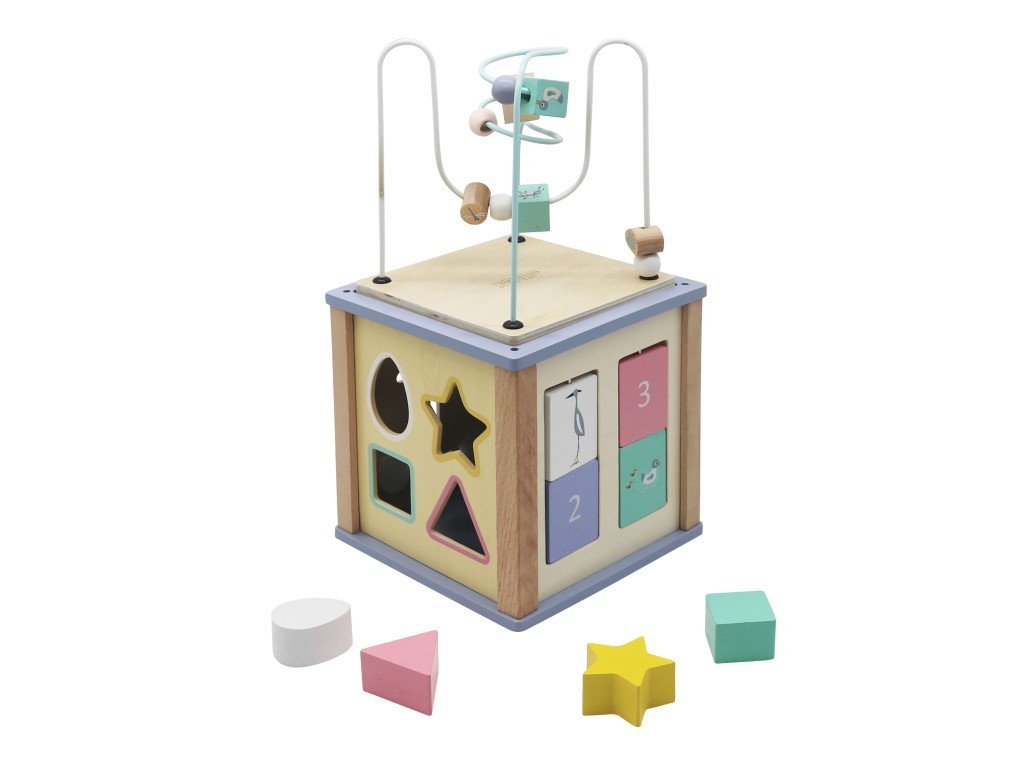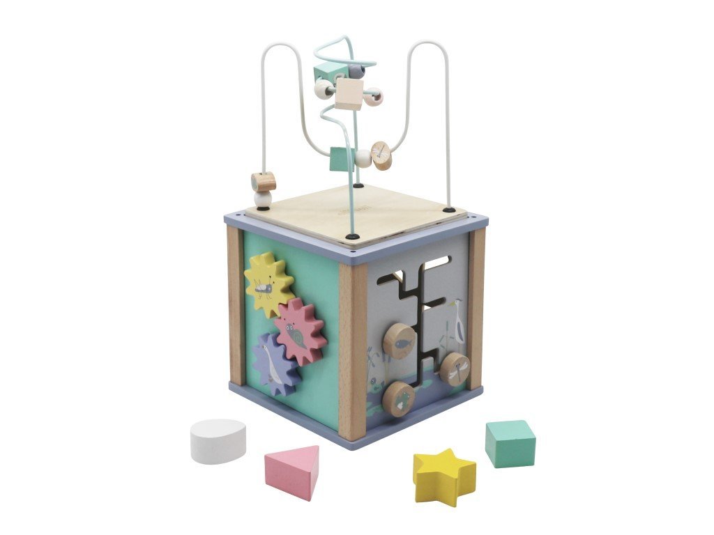 A fából készült játszókockával kicsi és nagyobb gyerekek is jól szórakoznak. Lányok és fiúk egyaránt fejlesztik finommotorikát a különböző formájú színes gyöngyök csúsztatása közben a különböző motívumokkal rendelkező színes, kusza, vezetékeken. Edzik a szem-kéz koordinációját és a térbeli képzelőerőt a kocka oldalán található nyílásokba a különböző formájú kockák behelyezését. A gyerekek megforgathatják a fogaskerekeket és felfedezhetik, hogyan lehetséges az, hogy ha csak egyet forgatnak, mégis mindegyik megfordul. A forgatható színes lemezeknek segítségével a gyerekek megtanulják felismerni színeket, számokat és madarakat. A játszókocka oldalán található Labirintus a gyerekeket a vízi birodalom környékére viszik, ahol szitakötővel, békával vagy hallal mehetnek végig az ösvényeken.