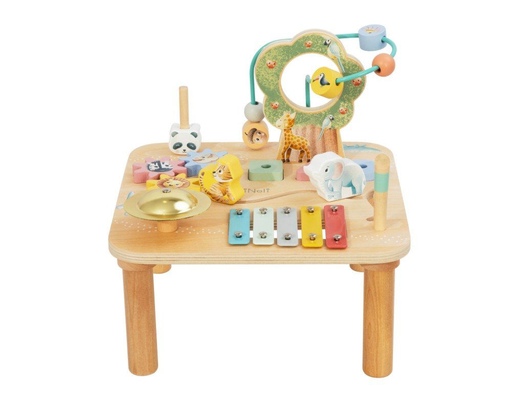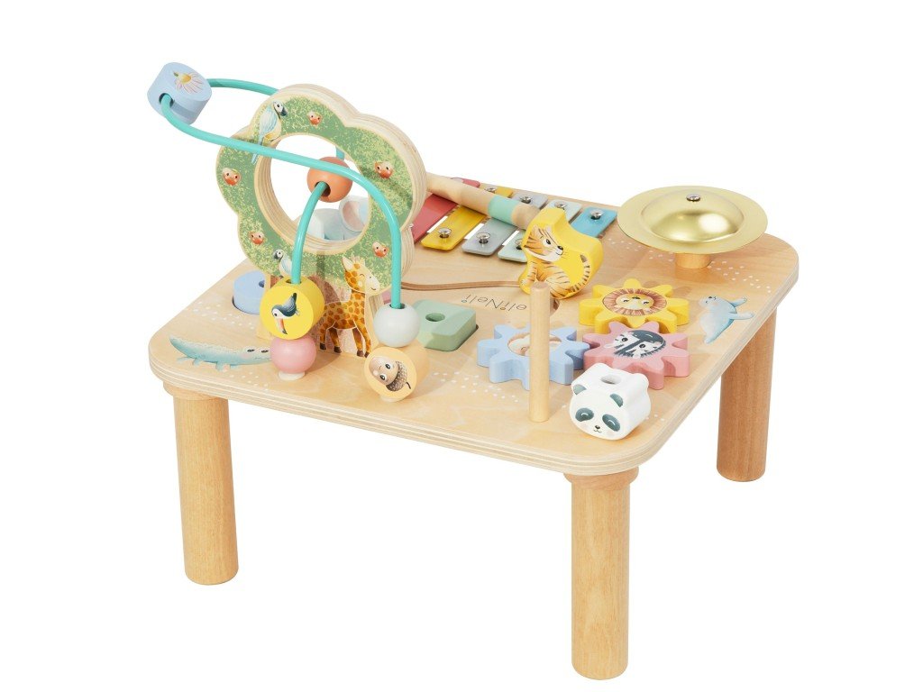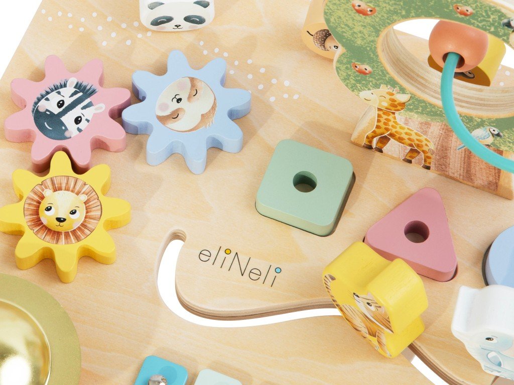 Dřevěný motorický stoleček v barevné kombinaci přírodního dřeva s překrásnými pastelovými barvami nabízí dětem spoustu možností ke hře, zdokonalování dovedností a získávání nových. Stoleček s aktivitami děti zabaví na celé hodiny, je vhodný pro jednotlivce i skupinku. Na stolečku děti najdou celou řadu aktivních prvků na jednom místě - parádní korálkové bludiště, nasazovací hru s medvídkem pandou, ozubená kolečka se zvířátky, vkládačku s různými geometrickými tvary, bludiště i hudební nástroje, které vaše dítko promění v malého muzikanta.