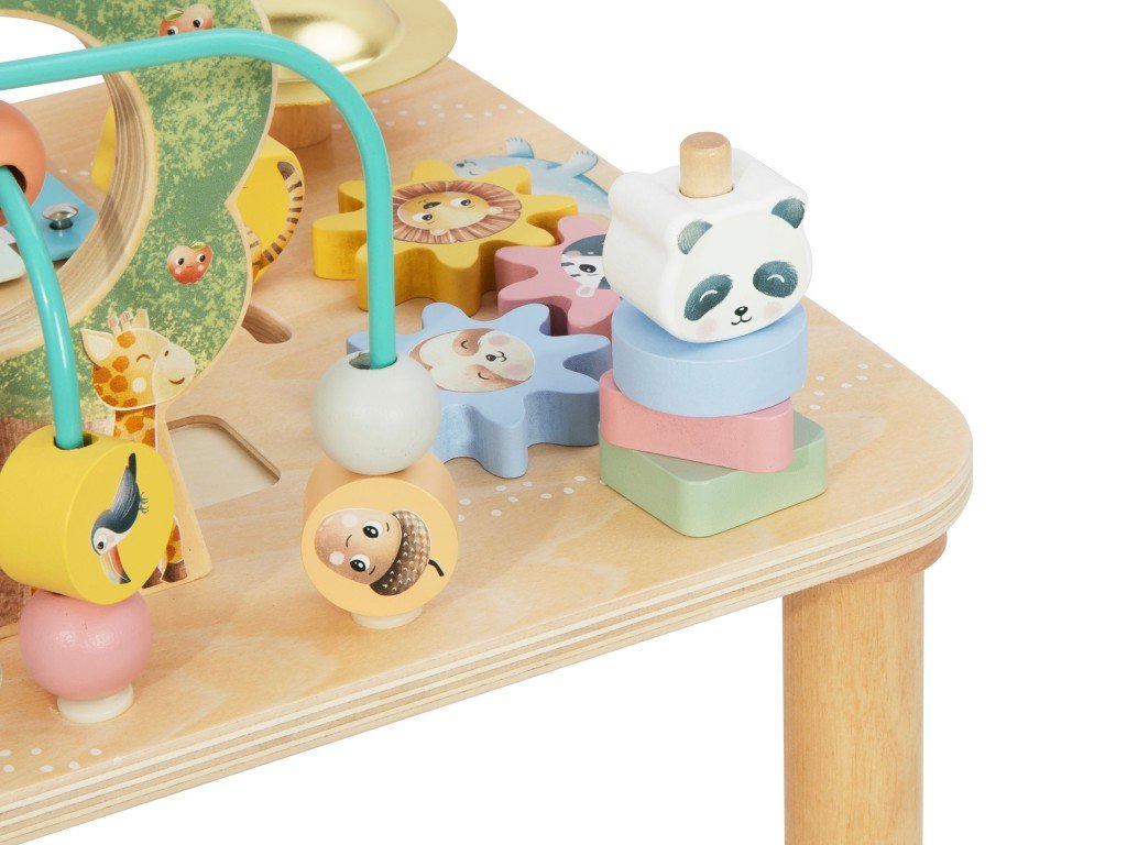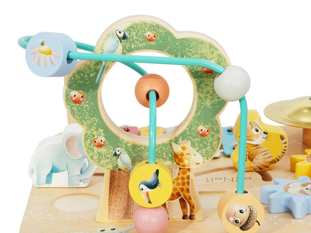 - Spousta hracích (aktivních) prvků - na stolečku najdou děti nejoblíbenější aktivní prvky, které trénují dětské dovednosti - drátkové bludiště, vkládačku, nasazovací hru, ozubená kolečka, bludiště.