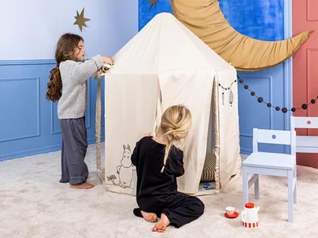 A gyerekek imádják a kuckókat, búvóhelyeket és saját kis házikókat. A tanúsított pamutból készült textil pavilon, a kör alakú fa vázzal és a barátságos Mumin‑mintával olyan gyorsan a kedvencükké válik, hogy nagy eséllyel aludni is benne szeretnének. A gyerekek fantáziájában a pavilon bármivé átalakulhat – játék házikóvá, bolttá, könyvtárrá, dzsungelbeli búvóhellyé, oázisban álló hűs kunyhóvá vagy egyszerűen egy meghitt kis kuckóvá. Elég néhány takaró és párna, és máris órákra leköti őket a játék.