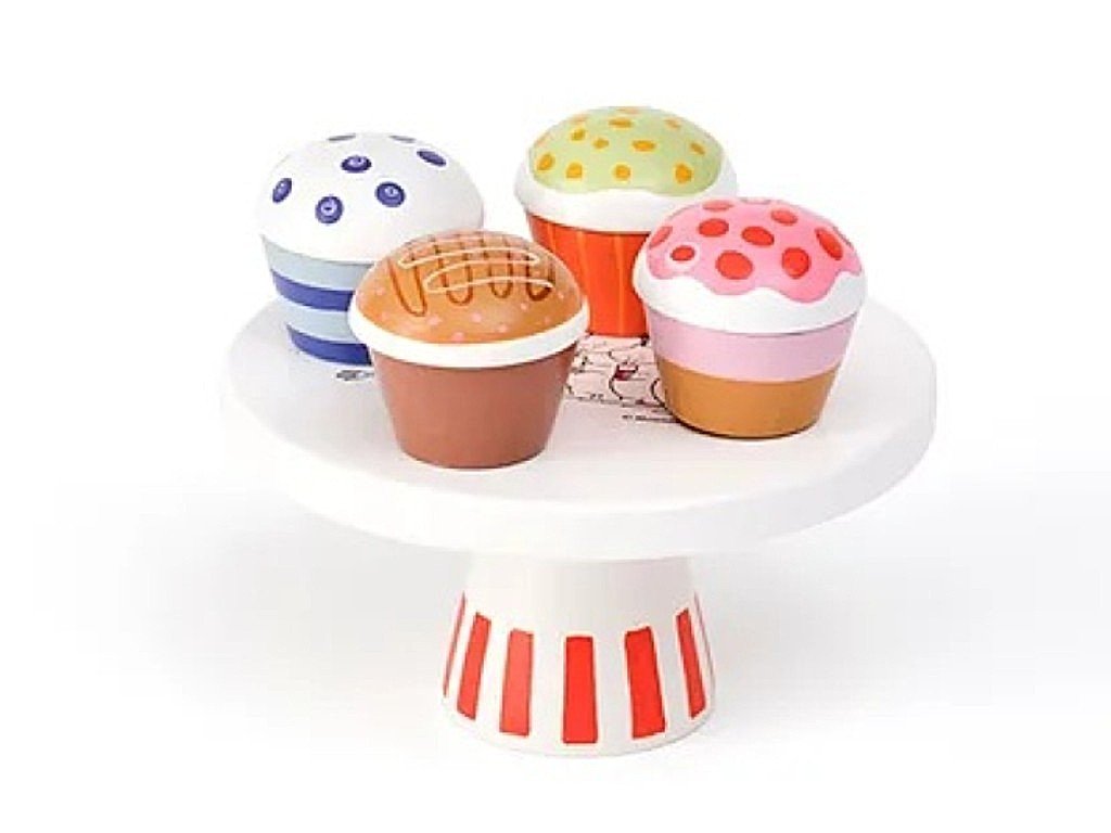 A Mumin‑völgyben a sütemények és tortácskák fontos szerepet játszanak – ők a jókedv, a tele pocakok és a barátokkal töltött felejthetetlen pillanatok titka. A magas, fából készült süteményes állványon, amelyet a Mumin család nyomtatott mintája díszít, négy színes cupcake várja a kis cukrászokat. A gyerekek sütögetős, felszolgálós vagy boltos játékokhoz is használhatják saját konyhájukban vagy boltjukban.