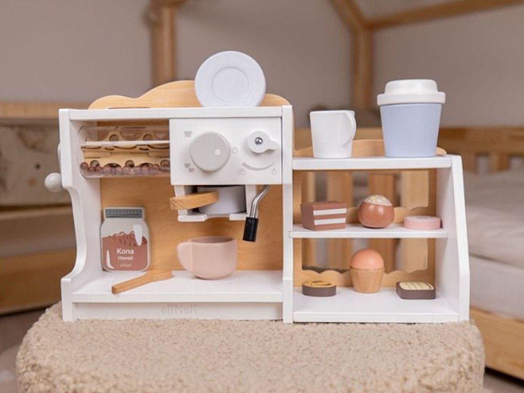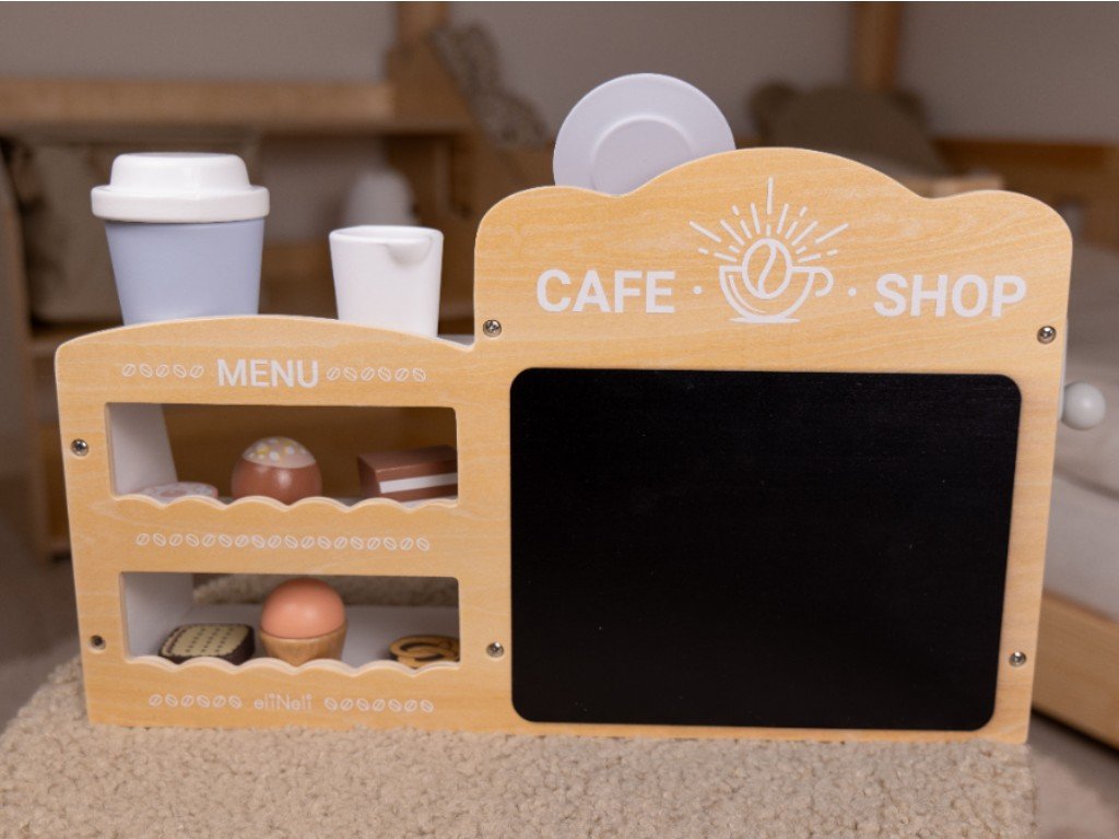 2 az 1-ben fa játék - Ez a kávéfőző és bolt rengeteg játékvariációt kínál a gyerekeknek. A gazdag kiegészítőkkel ellátott kávéfőző lehetővé teszi a szerepjátékot, segíti a szociális kapcsolatok építését, a kreativitás fejlődését, valamint fejleszti a finommotoros képességeket, a kéz-szem koordinációt és a kézügyességet, miközben rengeteg szórakozást nyújt.