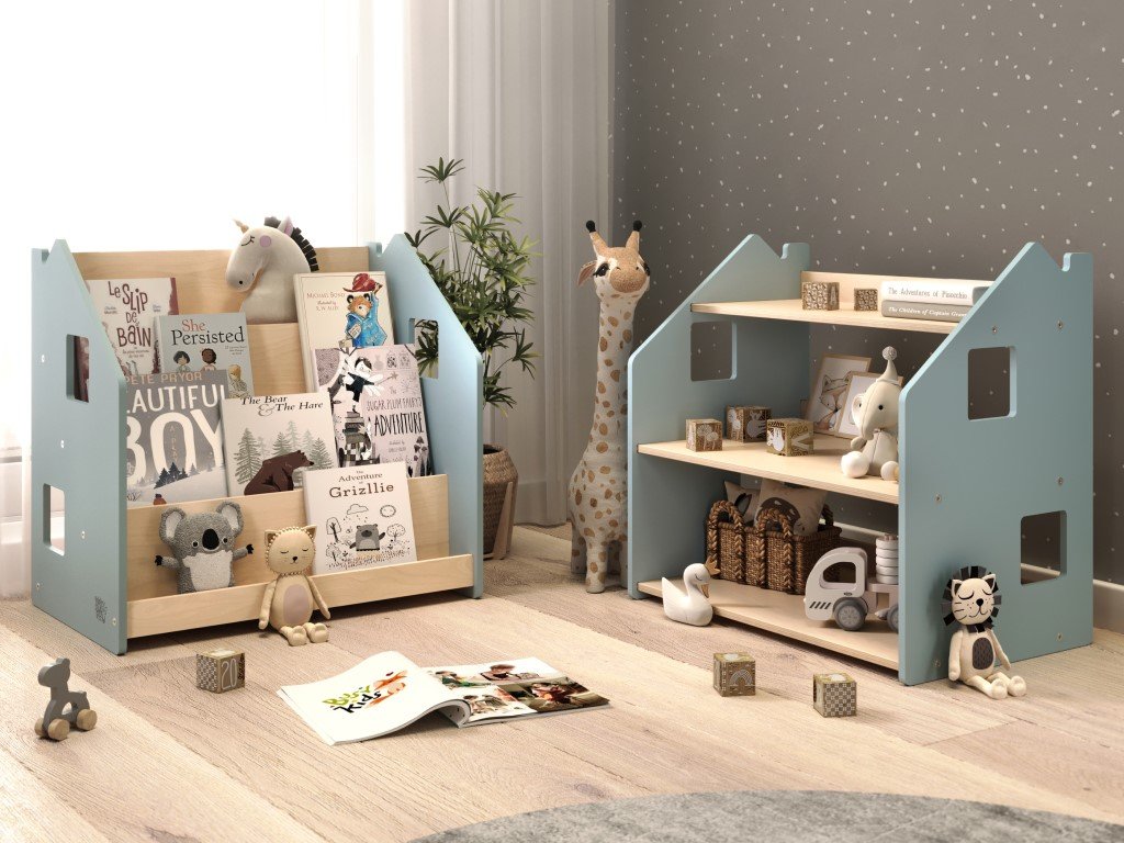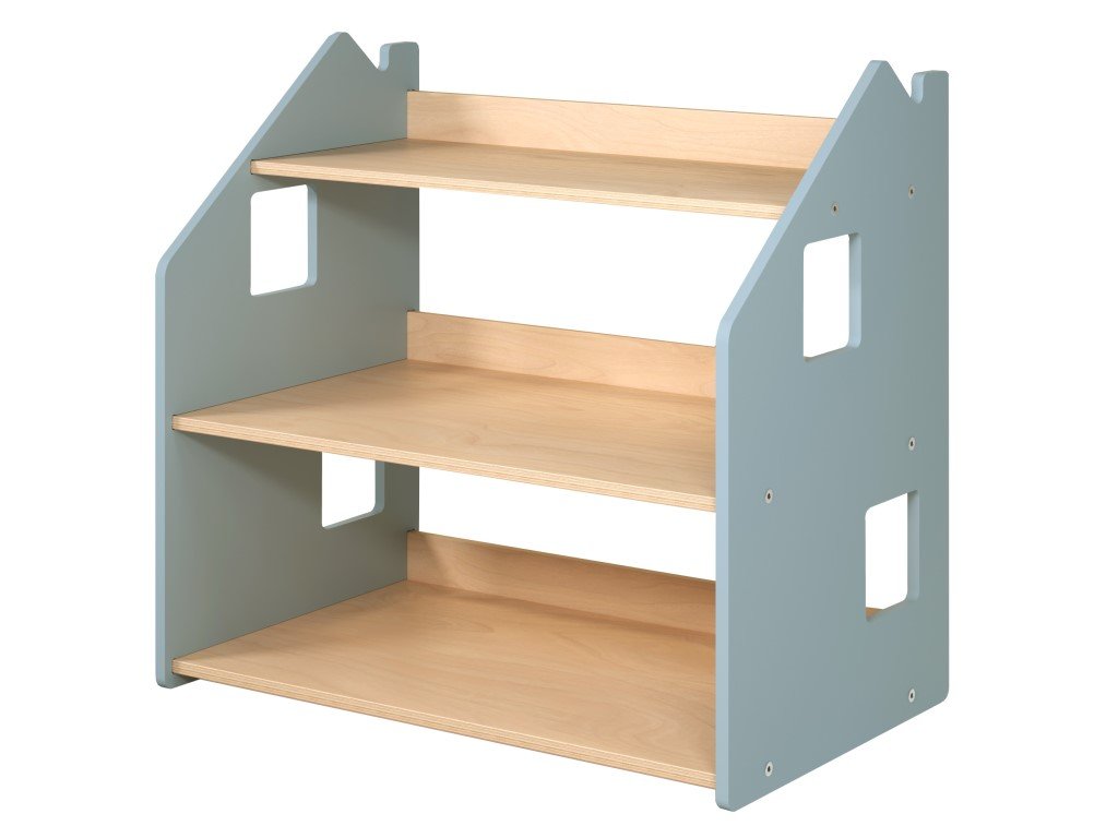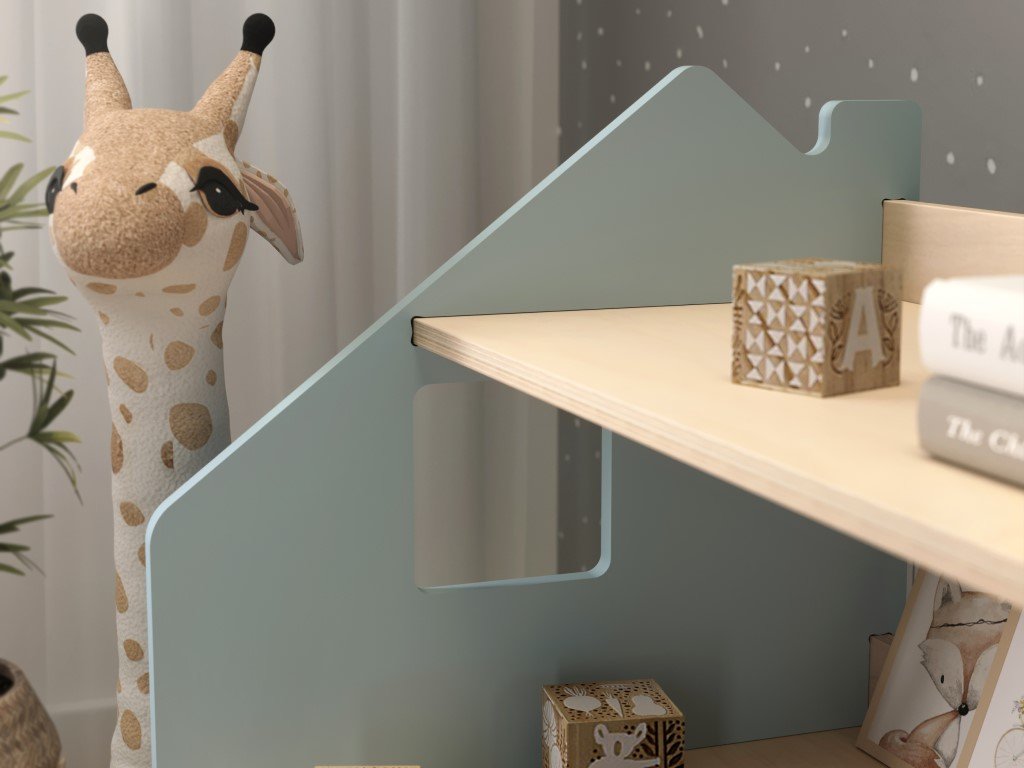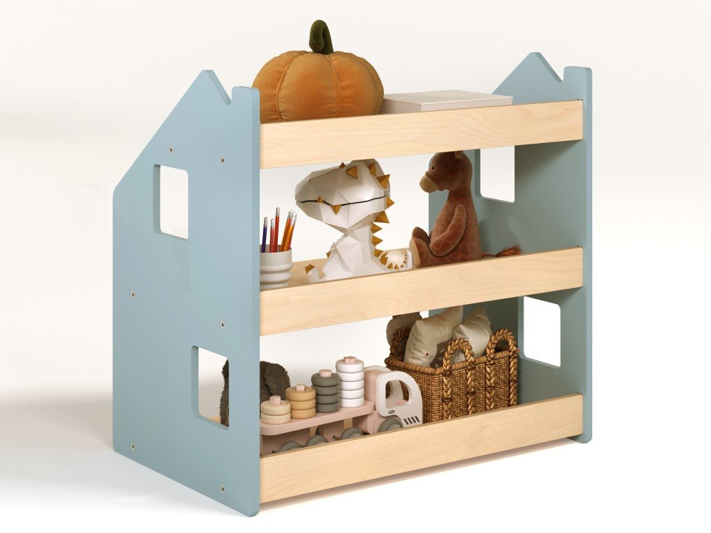 A gyerekszobai könyvespolc és tároló bájos házikó‑designnal igazi dísze lesz minden gyerekszobának. A fa házikó polc a természetes fa színű polcokkal és pasztellkék oldallapokkal ideális hely a könyvek, autók, játékok és apró kincsek számára. A többszintes házikó forma nyeregtetővel, ablakokkal és kéménnyel nemcsak praktikus, hanem egyben stílusos és minőségi gyerekbútor is.