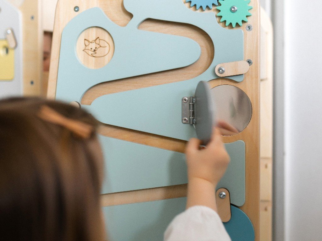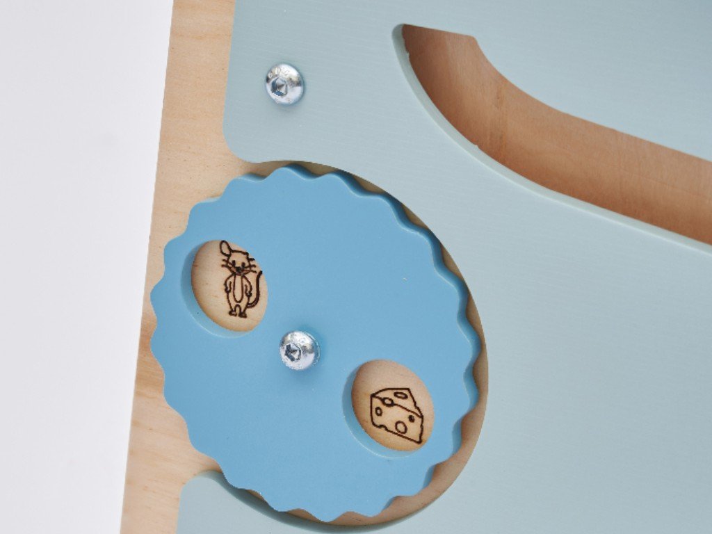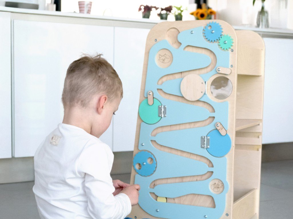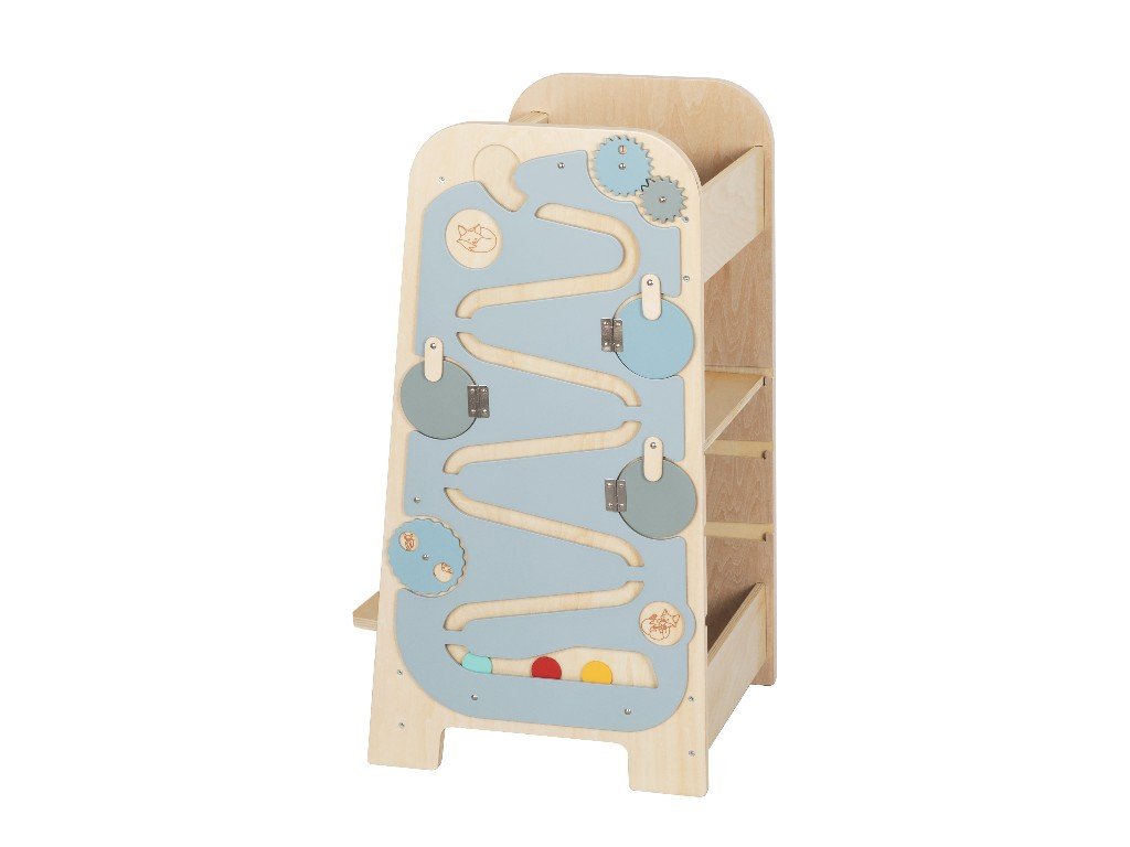 A tanulótorony egyik oldalán található activity board számos meglepetést rejt a zárt kerek ajtók mögött, gyönyörű képeket, fogaskerekeket és egy igazán hosszú golyópályát. A tanulótorony másik oldala egy nagy rajztábla, amelyre a gyerekek színes krétákkal írhatnak és rajzolhatnak.