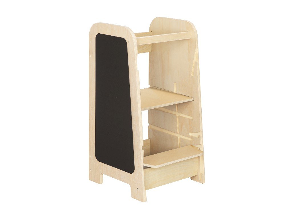 A növekvő tanulótorony kialakítása egyszerű, de funkcionális. Ez biztosítja a konyhai segítő szilárdságát és stabilitását, és rengeteg helyet kínál a Play tanulótorony részét képező játékelemek elhelyezéséhez. A tanulótorony egyik oldalán egy nagy activity board található, egy nagyon hosszú golyópályával és egy nagy rajztáblával a másik oldalán.