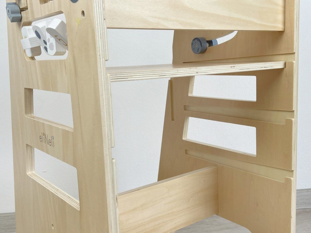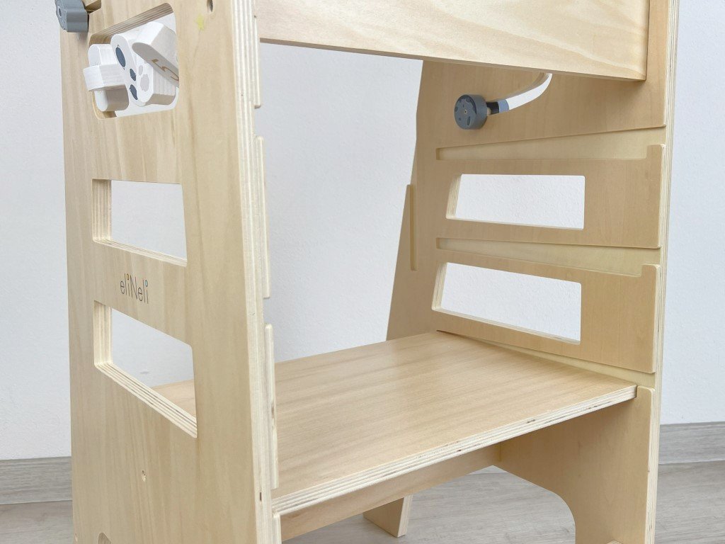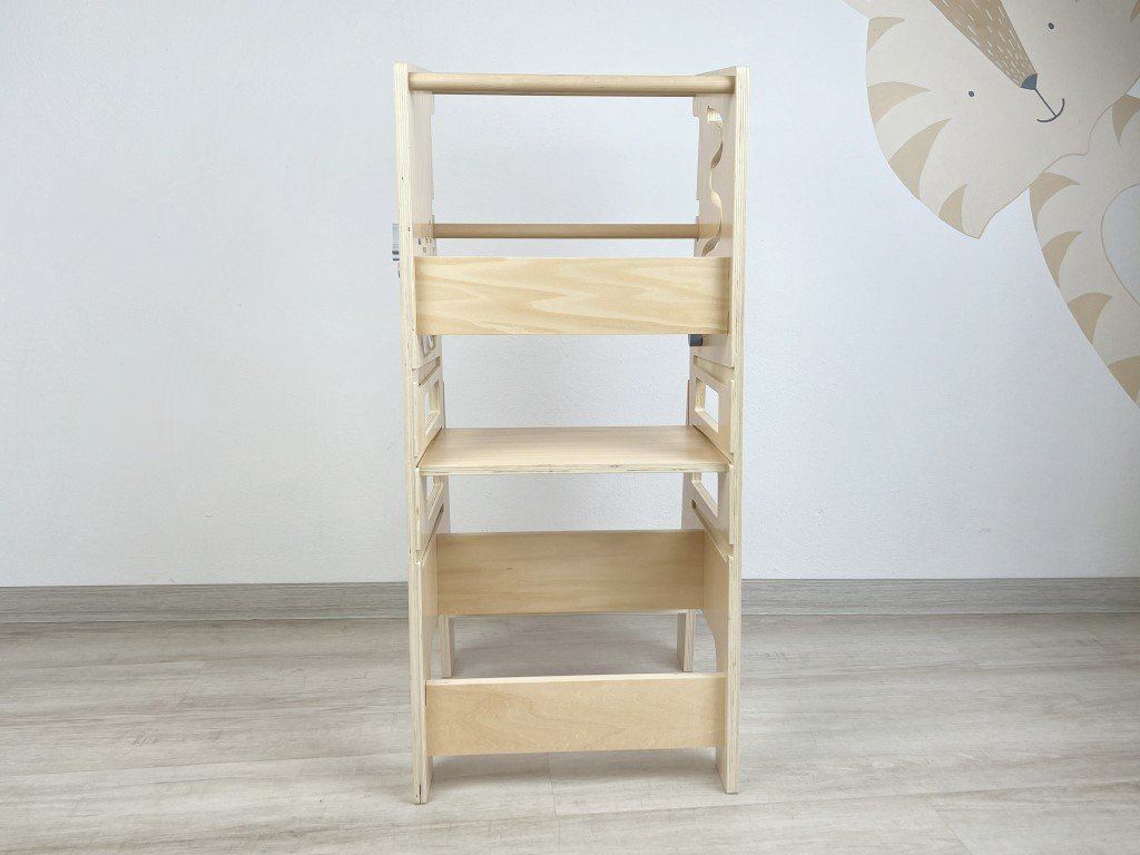 - A semleges színű, rétegelt lemezből készült és vízbázisú lakkal kezelt tanulótorony praktikus eszköz és szép gyermekbútor az otthonba.